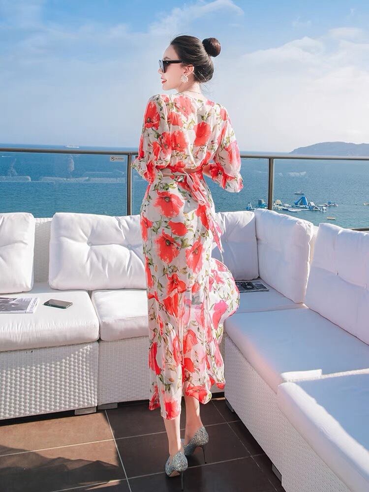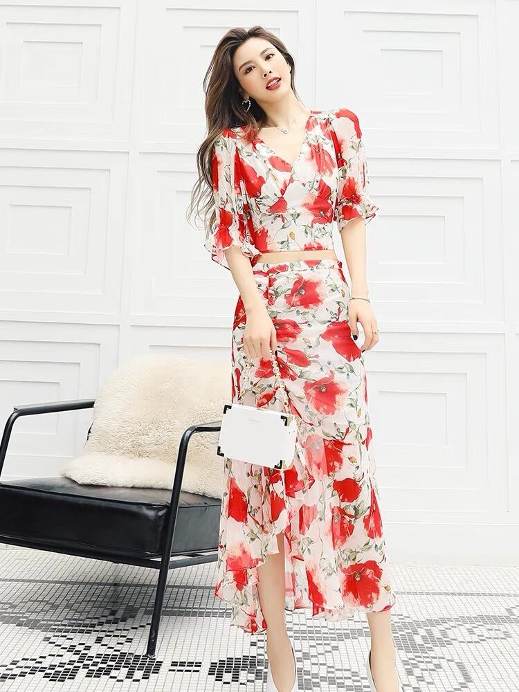 Pinkoz 夏花柄 2 点セット赤い花ドレス v ネック パフ スリーブ ショート トップス ブラウス マーメイド ミディ スカート女性ドレス セット ピンク レッド サマー 夏物 Vネック フラワーデザイン