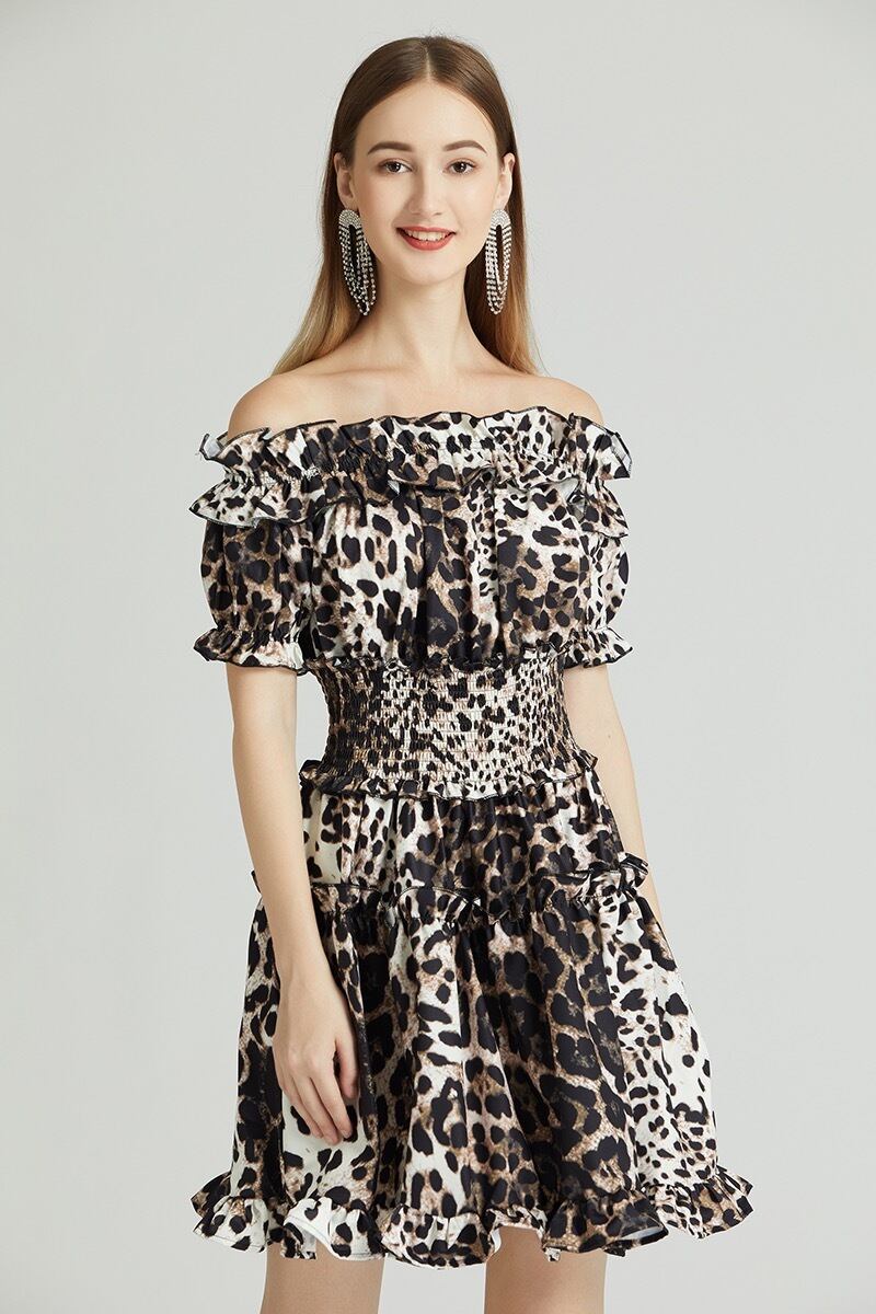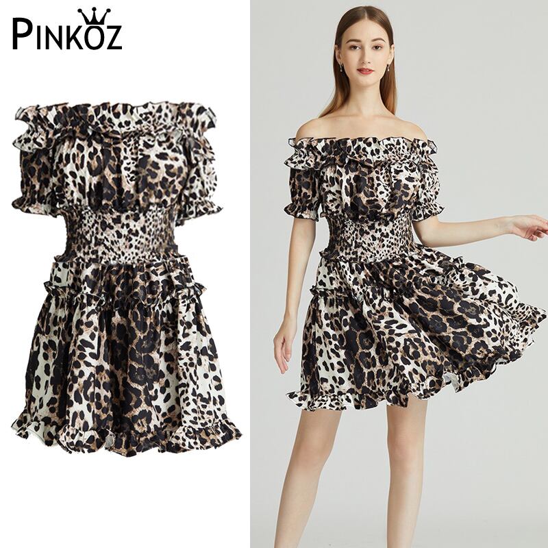 Pinkoz 新ファッション春夏ヒョウ柄フリルミニドレスオフショルダーウエスト弾性シャーリングホリデードレスローブ ピンク エラスティック 伸縮 スプリング 春物 サマー 夏物