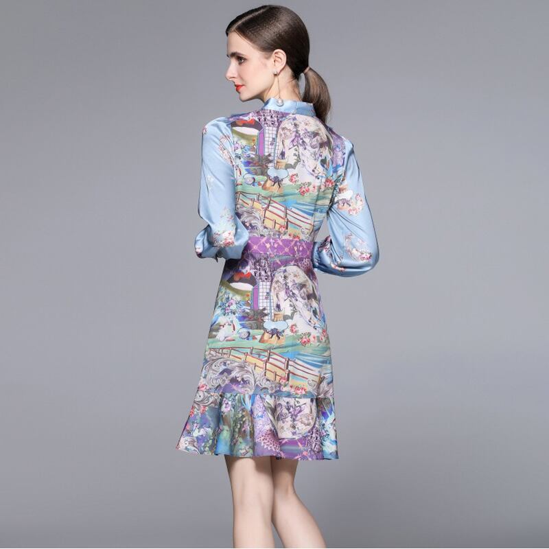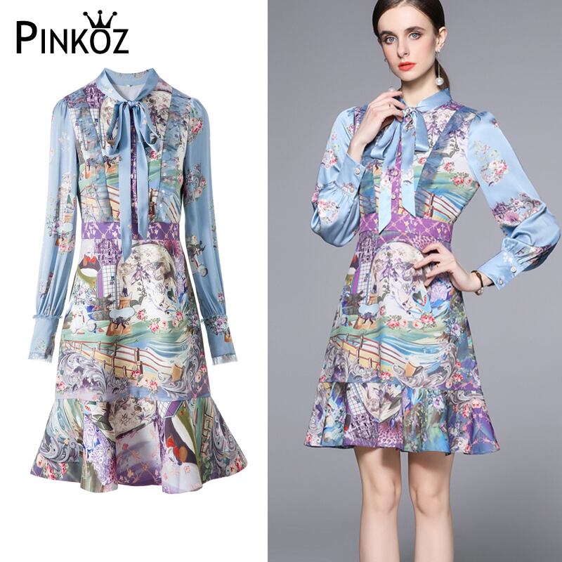Pinkoz 女性デザイナー ブルー ヴィンテージ レトロ パターン プリント レース アップ弓襟 a ライン パッチワーク シャーリング ミニ ドレス ショート ドレス新しい ピンク リボン Aライン レースアップ ビンテージ