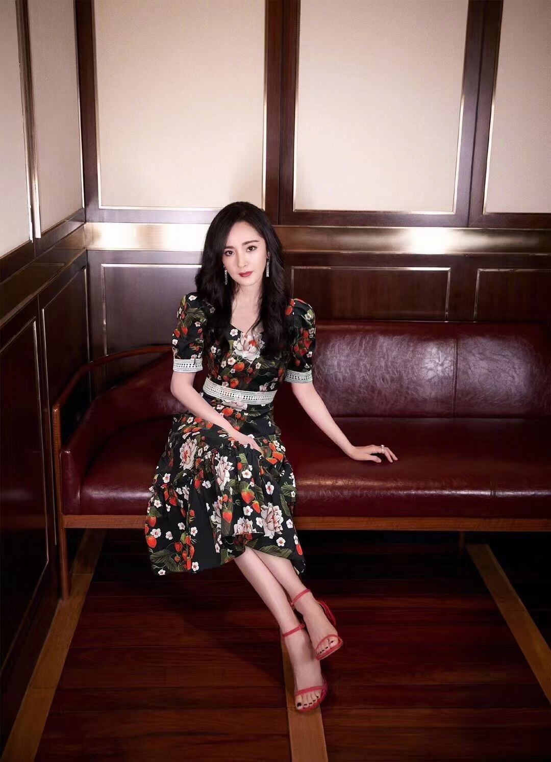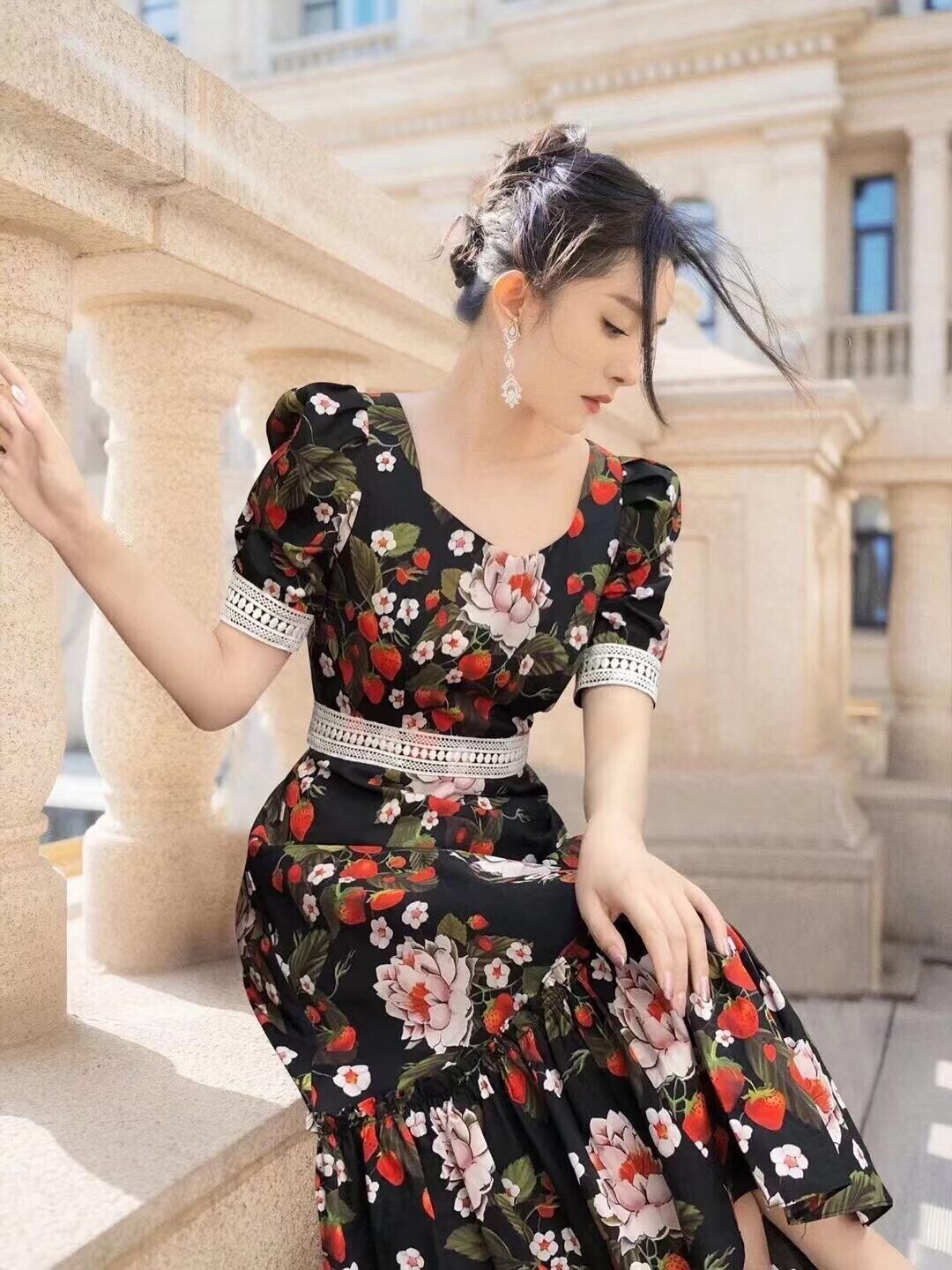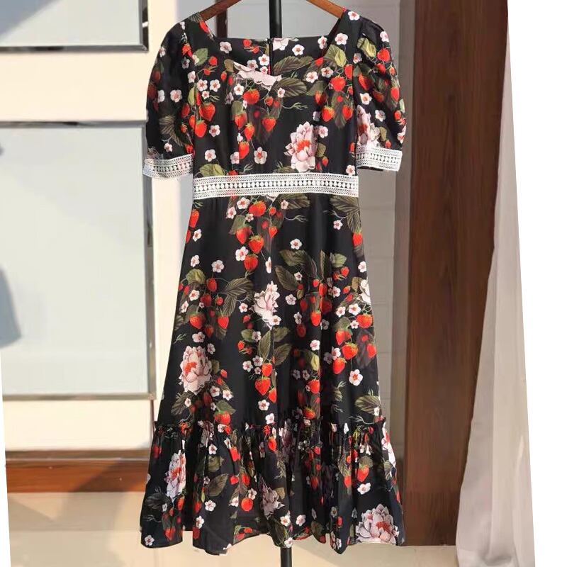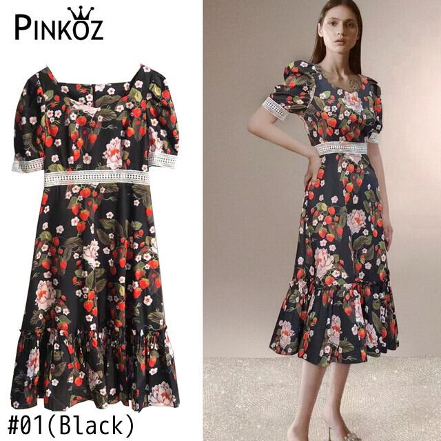 Pinkoz 滑走路刺繍ドレス女性の夏のランタンスリーブレッドフラワープリントスラッシュネックパーティードレス vestidos ピンク サマー 夏物 フラワーデザイン