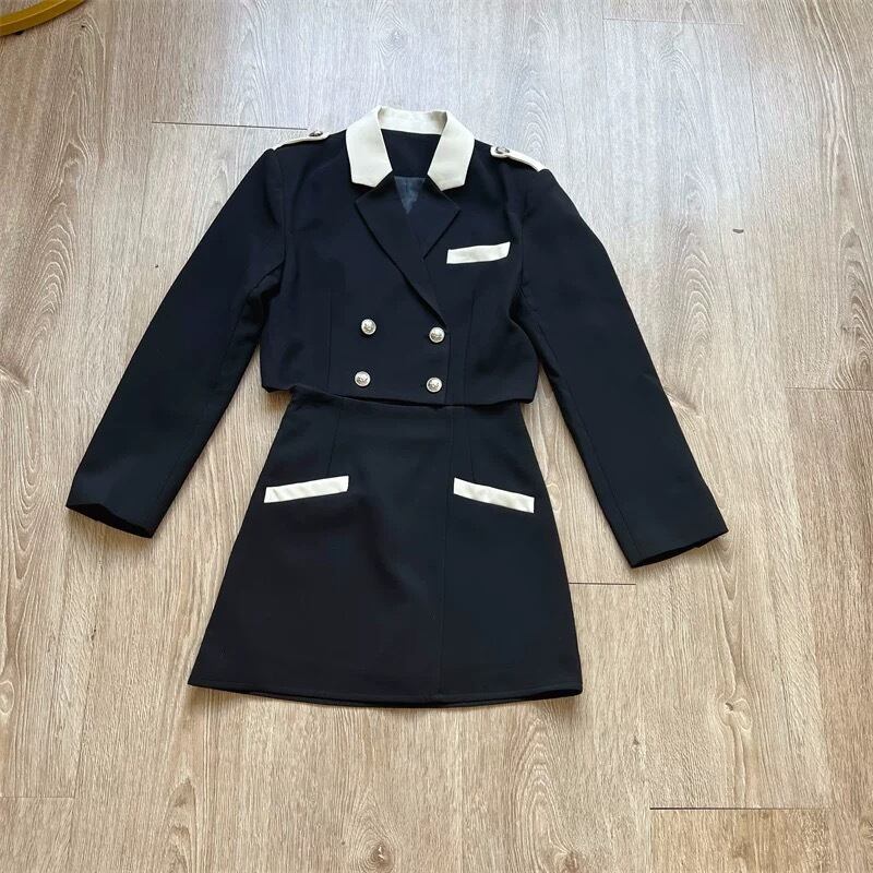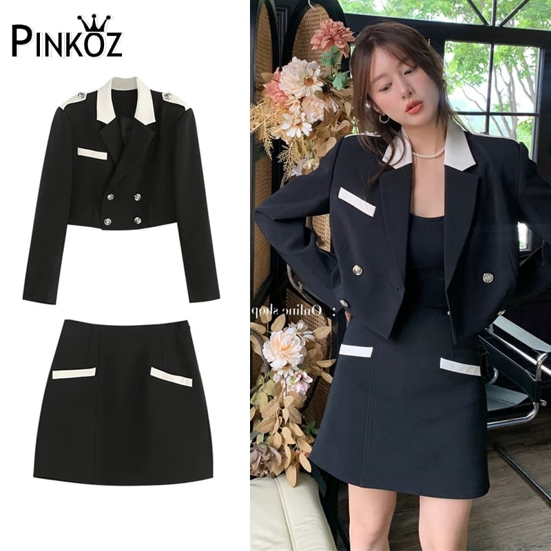 Pinkoz 2 ピースセット女性ブラックホワイトパッチワーク女性トップスショートブレザージャケット + ショート Skrit 2 ピースセット秋の衣装 Traf ピンク オータム 秋物