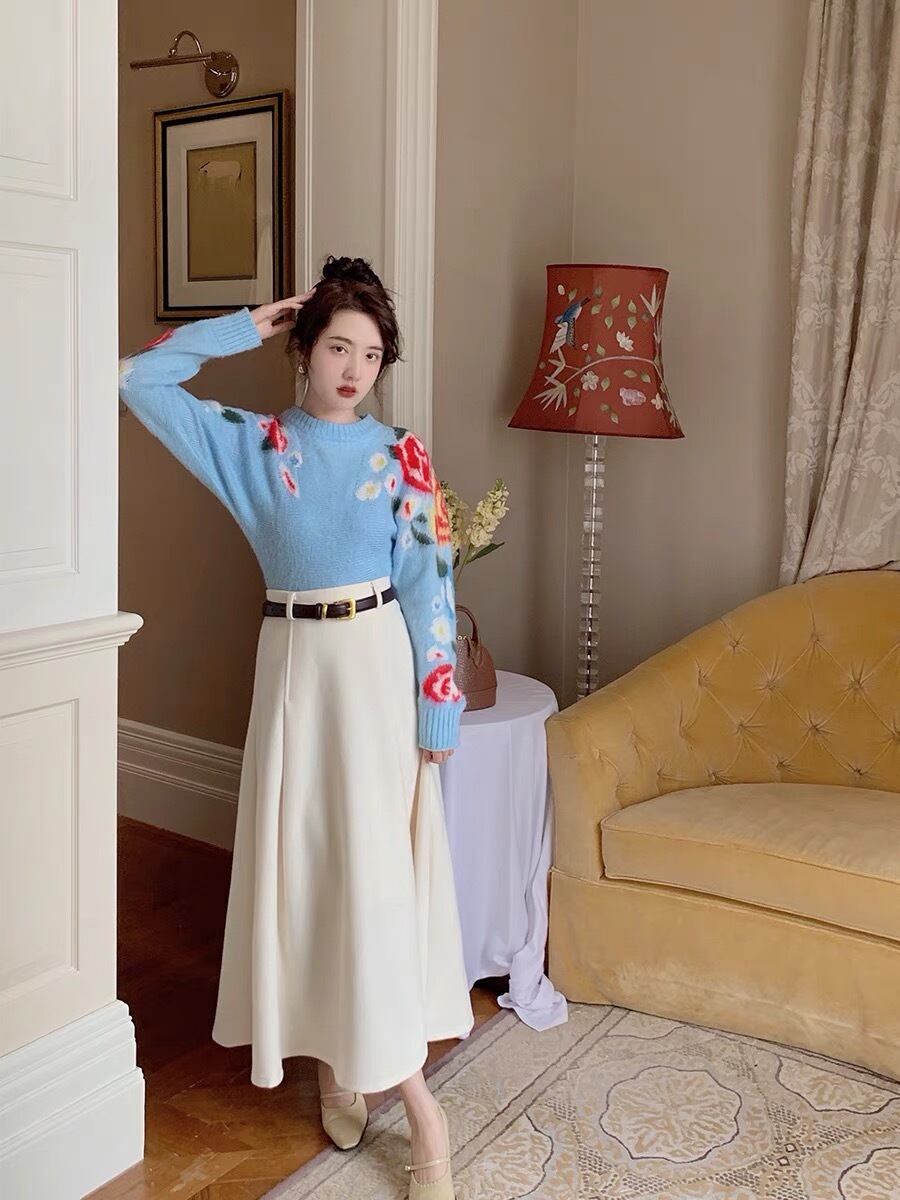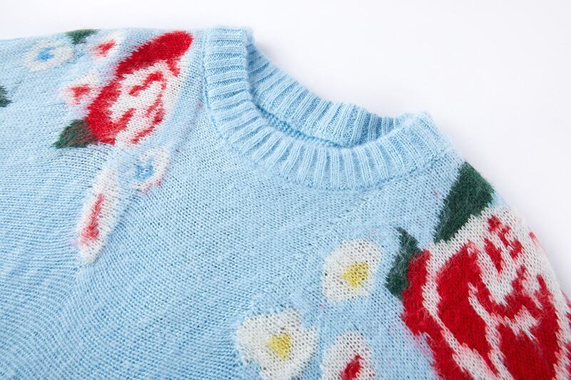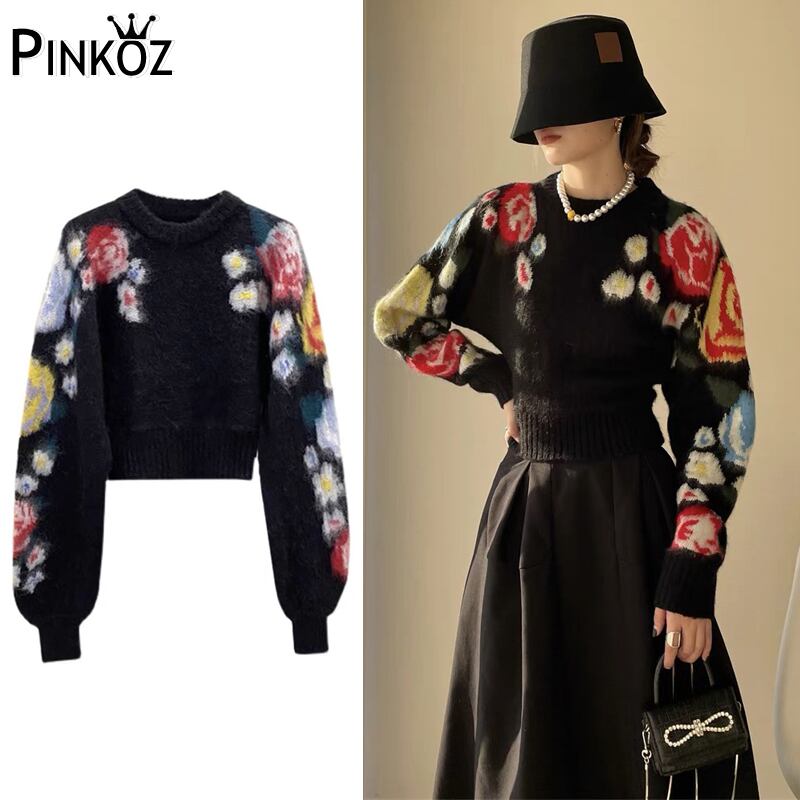 Pinkoz 女性カジュアルセーターブラックショートレッドフラワー O ネックロングスリーブストリートウェア秋冬シックなヴィンテージニットトップス traf ピンク 長袖 オータム 秋物 ウィンター 冬物 Oネック フラワーデザイン ビンテージ