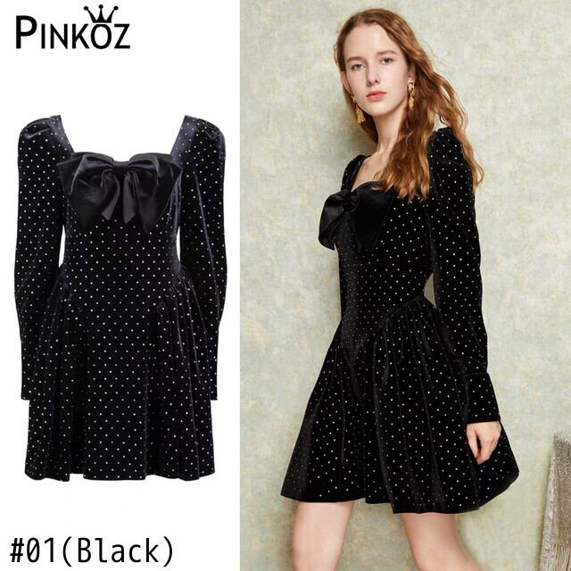 Pinkoz 滑走路デザイナー黒水玉 A ライン ミニドレス弓フル スリーブ ゴシック シックなハイ ウエスト エレガントなベルベット ドレス traf ハイウェスト ピンク ブラック リボン Aライン