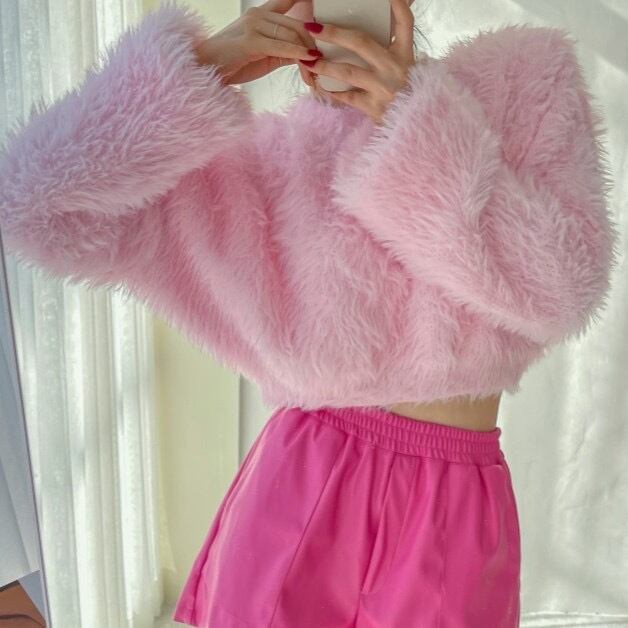 Pinkoz 女性デザイナー ピンク モヘア ショート セーター ピンク甘いお嬢様シックなハイ ストリート ファッション衣類ニット プルオーバー z 大人ガーリー スウィート キュート カジュアル