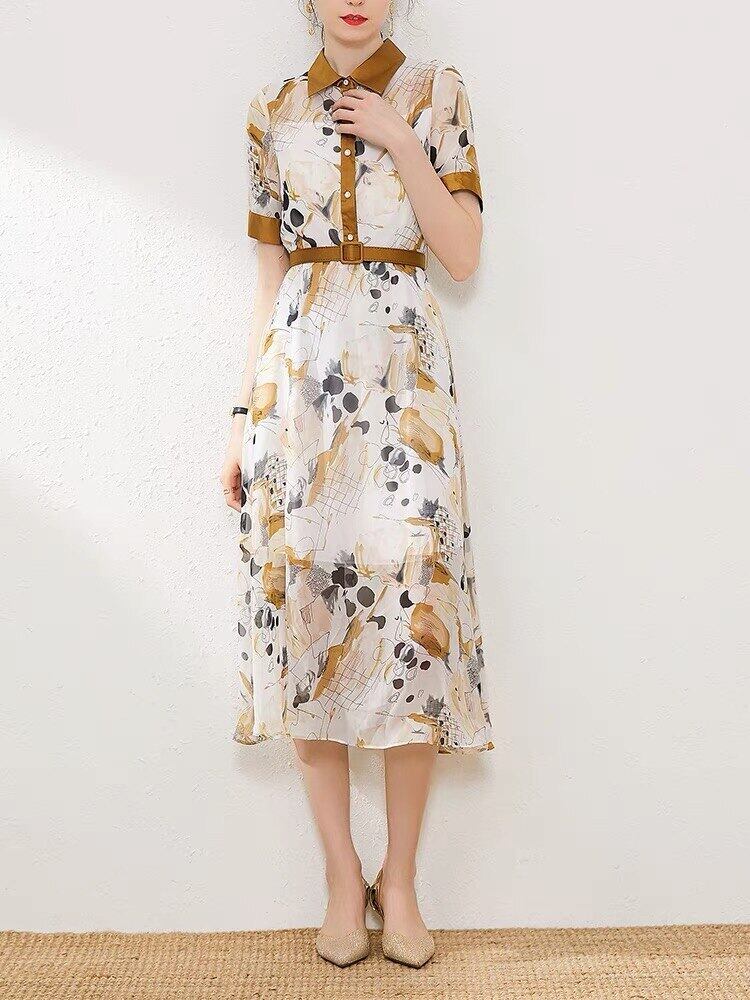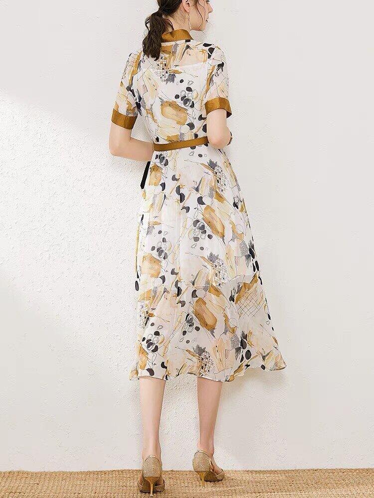 Pinkoz エレガントなターンダウン襟夏半袖ハイウエストドレス女性新ファッションプリントシングルブレスト A ラインローブ z ハイウェスト ショート ピンク ハーフスリーブ サマー 夏物 Aライン