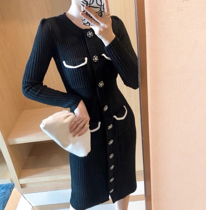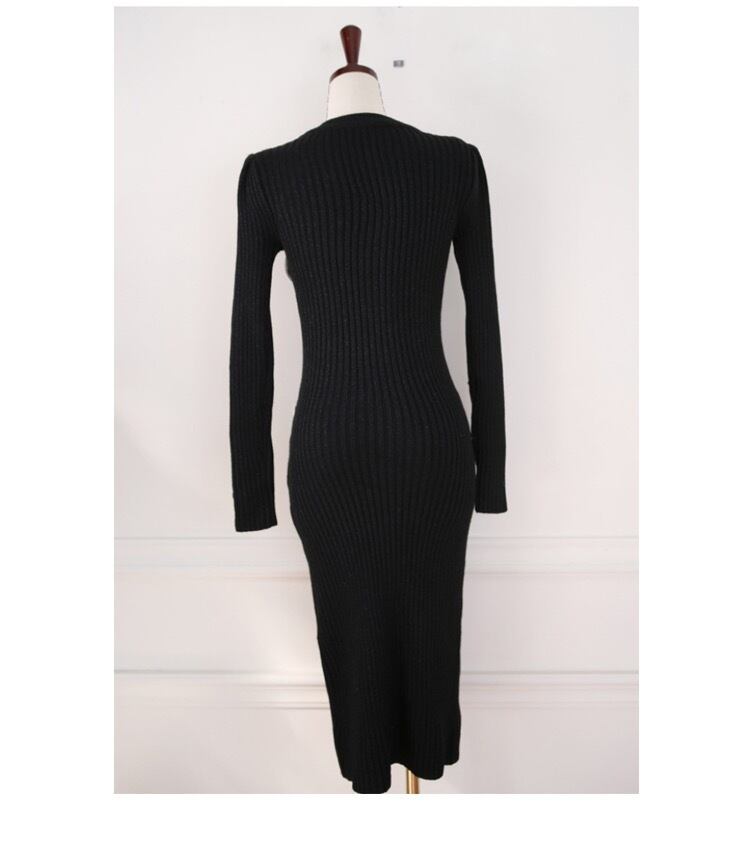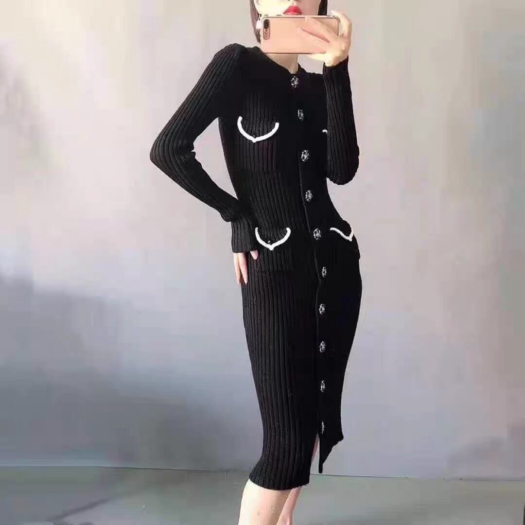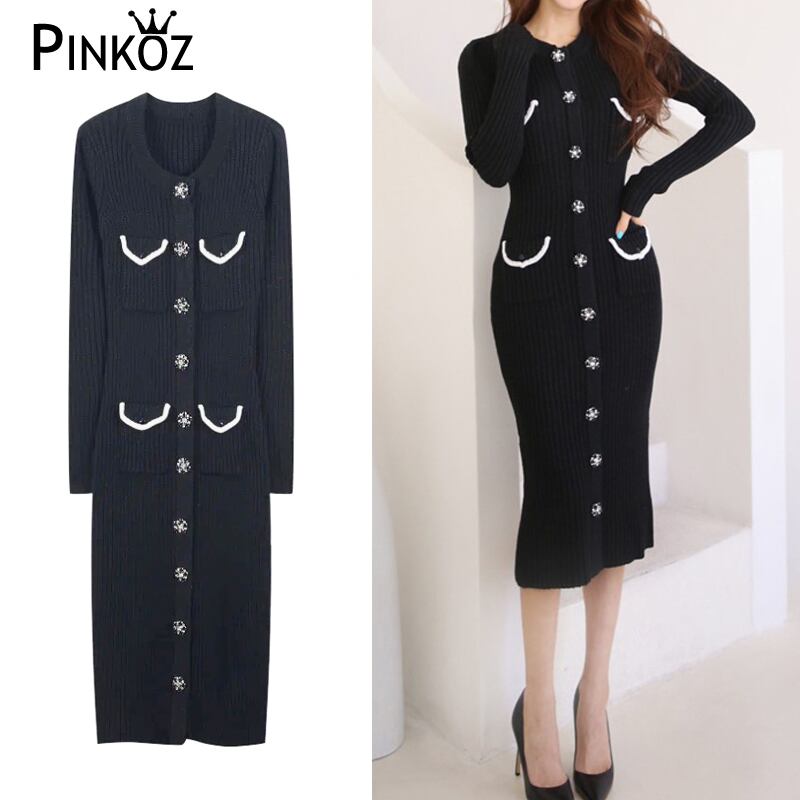 Pinkoz 女性滑走路デザイナー黒シングルブレストボタンミディドレスニットぬるぬるボディコンフルスリーブ冬ドレス vestidos ピンク ブラック ウィンター 冬物