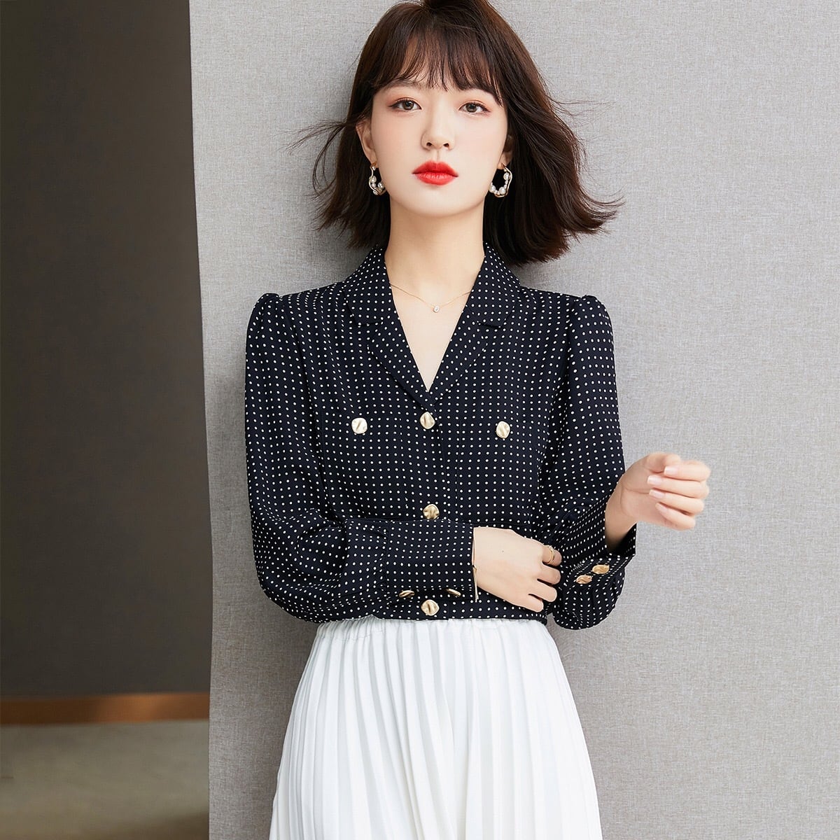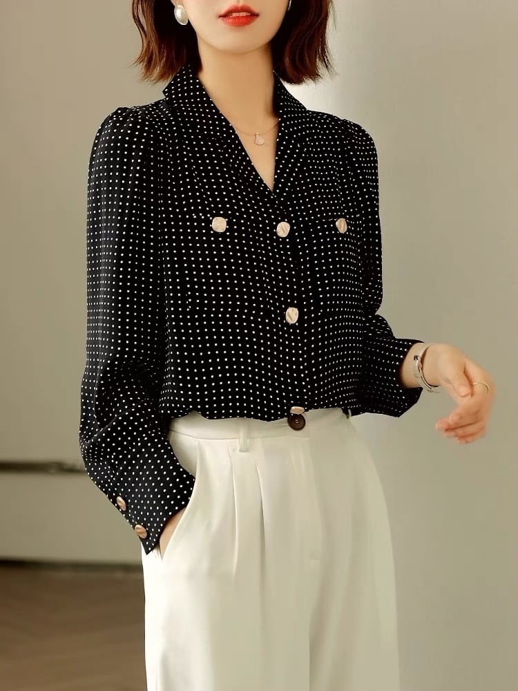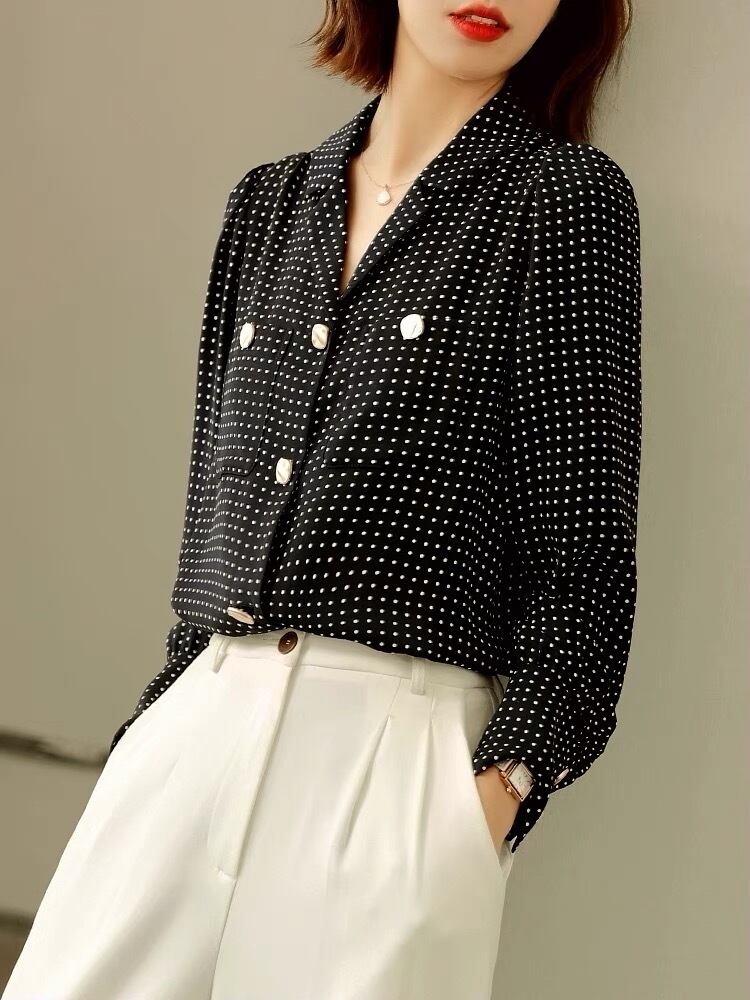 Pinkoz 黒水玉ブラウス女性シャツピーターパン襟ボタンポケットエレガントな女性オフィスシックなクロップトップスカジュアルプラスサイズ ピンク ブラック 大きめサイズ 会社 学校 通勤や通学にも