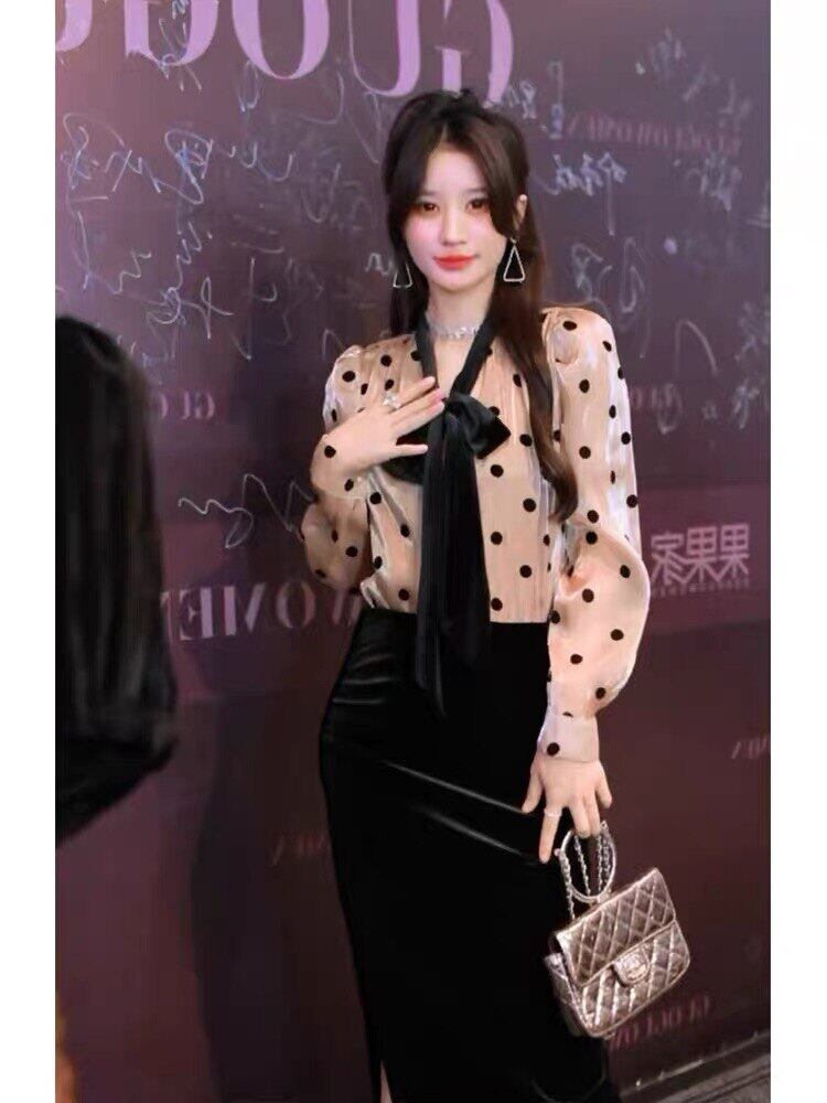 Pinkoz 女性 2 点セット水玉弓襟シフォン ブラウス長袖エレガントな黒ペンシル ベルベット スカート衣装ヴィンテージ ロング ピンク ブラック リボン ビンテージ