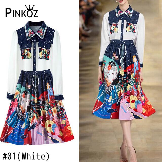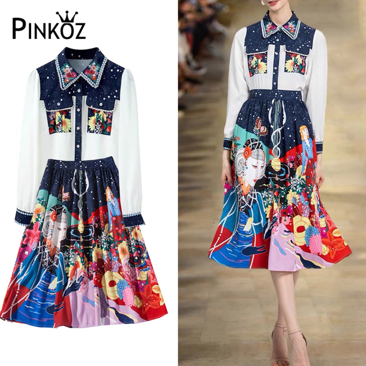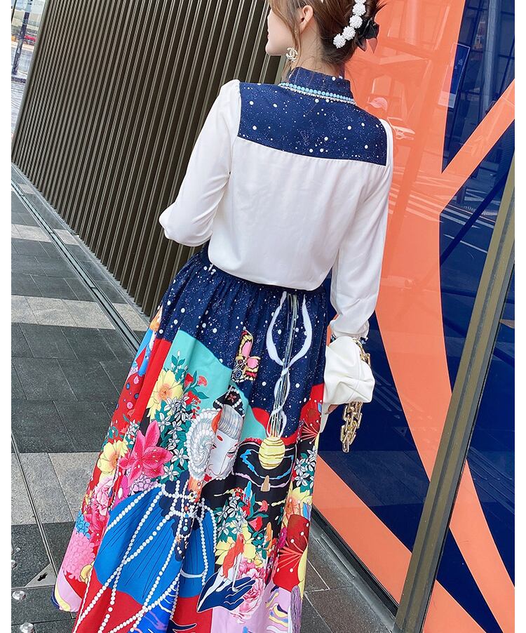 Pinkoz 2点セット 秋 パーティー 職場 フラワープリント シャツ トップス ブラウス Aライン ミディスカート シック レディース ピンク レース オータム 秋物 フラワーデザイン