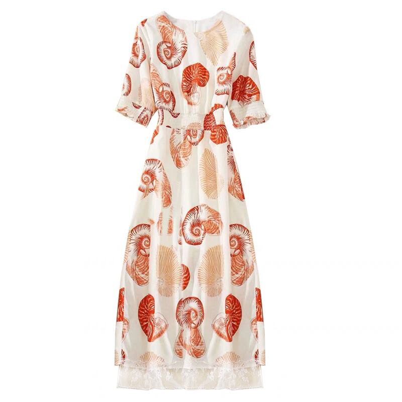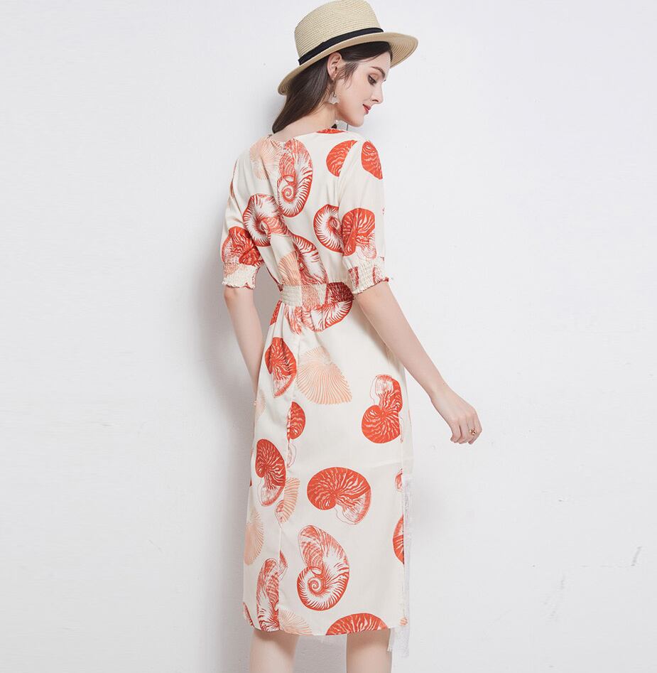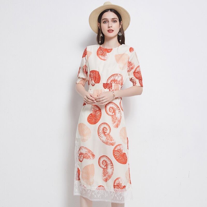 Piinkoz デザイナーファッション夏カジュアルプリント弾性ウエストミディドレス女性 O ネックパッチワークレーススプリットハイウエストヴィンテージ ハイウェスト エラスティック 伸縮 サマー 夏物 Oネック ビンテージ