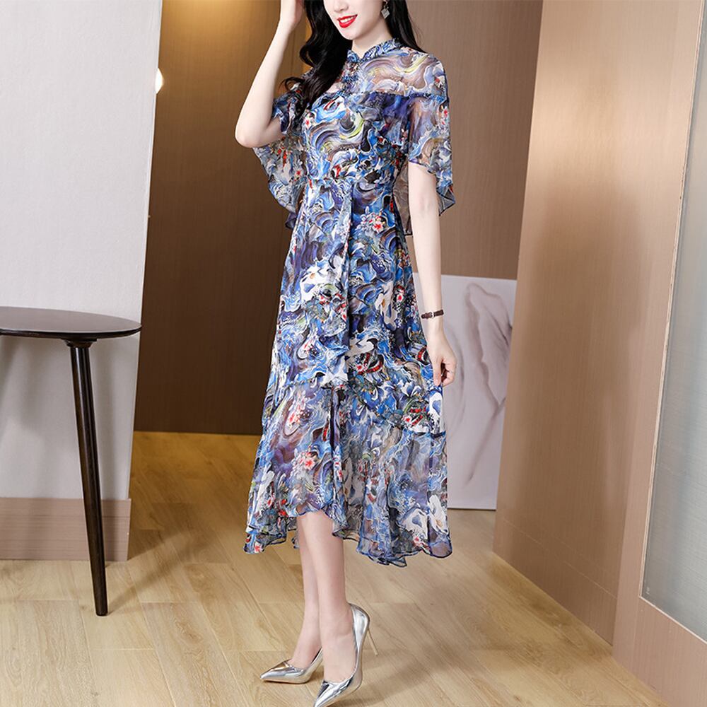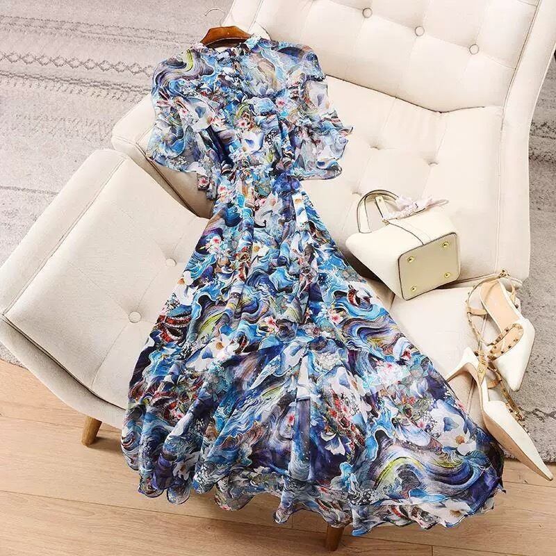 Pinkoz 女性カジュアルヴィンテージ絵画プリントエレガントなオフィスレディ大サイズバタフライスリーブフリル女性ドレス vestidos ピンク ラッフル 大きめサイズ ビンテージ 会社 学校 通勤や通学にも