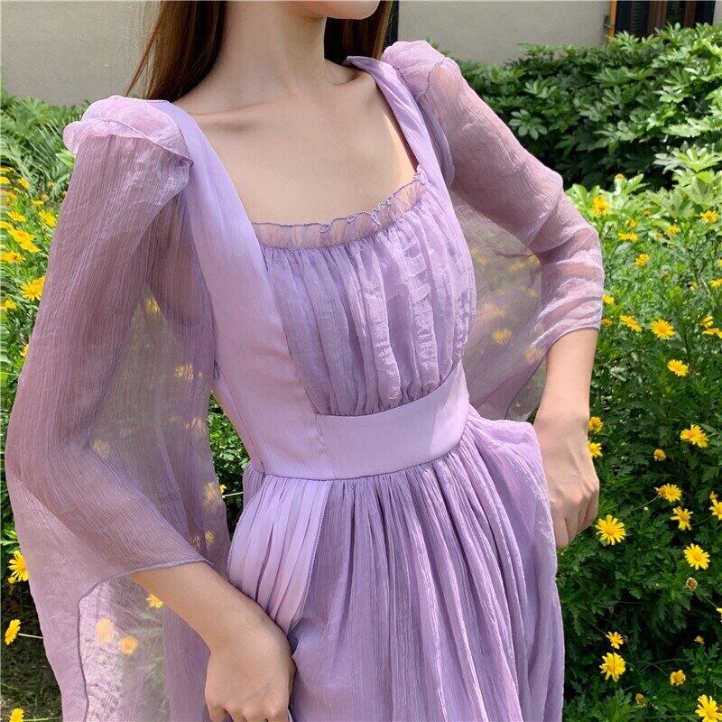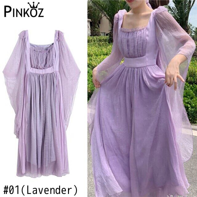 Pinkoz スクエア カラー ヴィンテージ女性マキシ ドレス ホリデー バイオレット ヒット カラー ハイ ウエスト カジュアル かわいい vestidos de mujer ファム 春 y2k ハイウェスト ピンク 大人ガーリー スウィート キュート スプリング 春物 フェミニン スクウェア ビンテージ