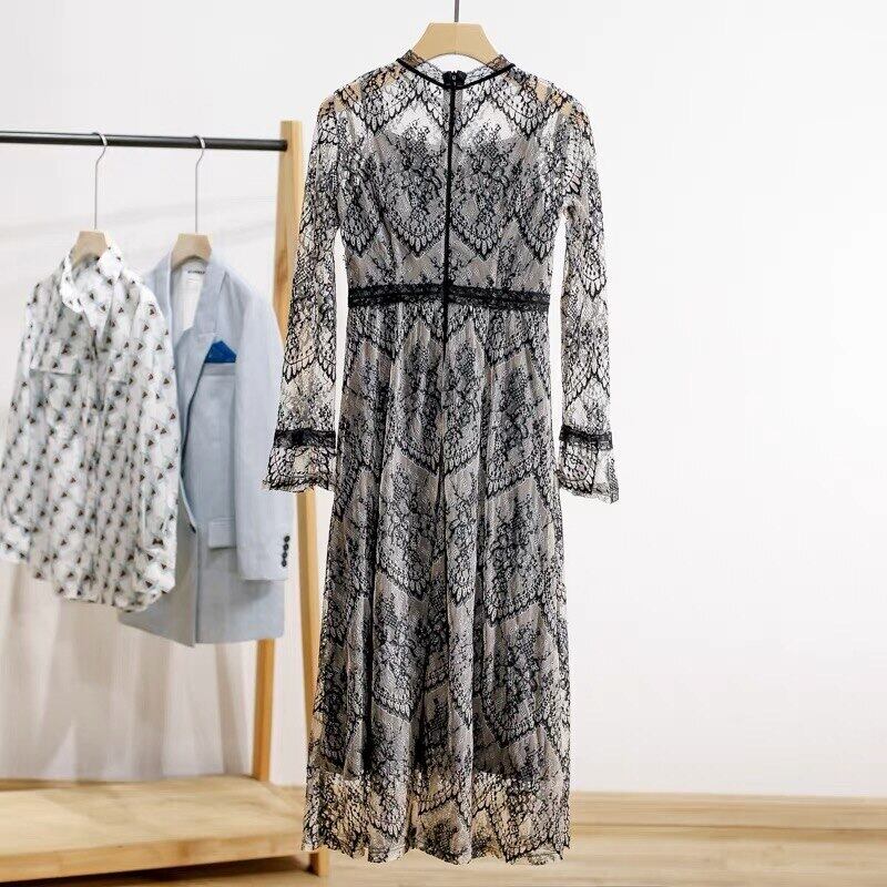 Pinkoz 女性 2 点セットミディドレスレーススタンドカラーエレガント弾性待機黒フルスリーブ春秋ローブ ピンク ブラック エラスティック 伸縮 スプリング 春物 オータム 秋物