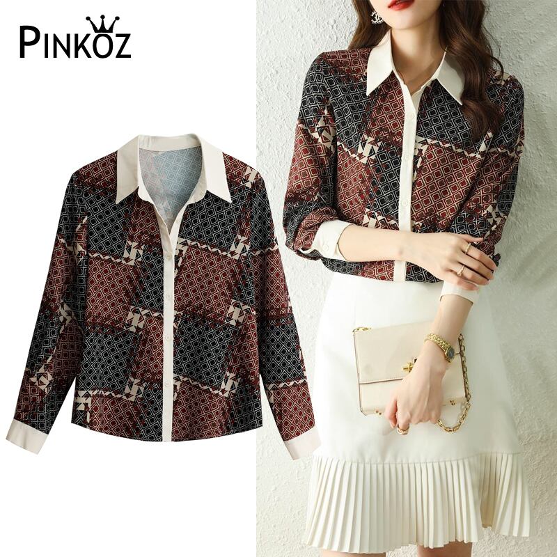 Pinkoz 格子縞の女性シャツターンダウン襟フルスリーブ春秋ヴィンテージイングランドスタイルオフィスレディルースブラウストップスファッション ピンク スプリング 春物 オータム 秋物 ビンテージ ヨーロピアン 会社 学校 通勤や通学にも