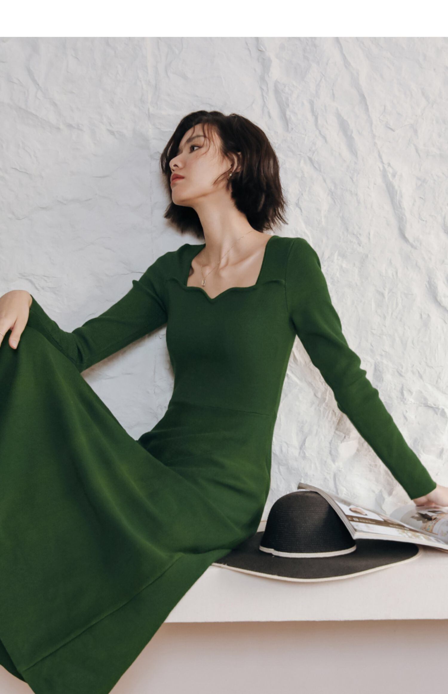 Pinkoz ヴィンテージ vestidos フランスのレトロなシックなメイゼルグリーン sqaure 襟 A ラインハイウエストニットミディドレス女性服 ハイウェスト ピンク Aライン ビンテージ