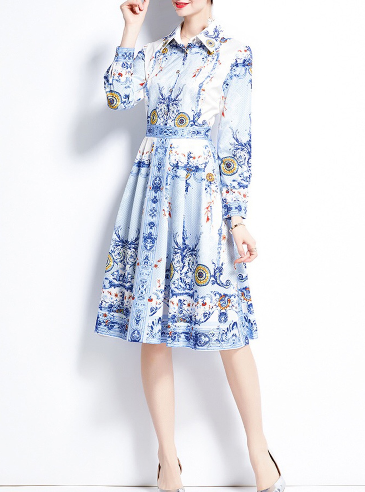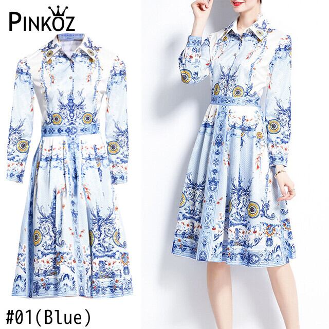 Pinkoz ライトブルー新秋膝丈ドレスプリントフルスリーブターンダウン襟エレガントな A ラインドレスファム vestidos ピンク オータム 秋物 Aライン フェミニン