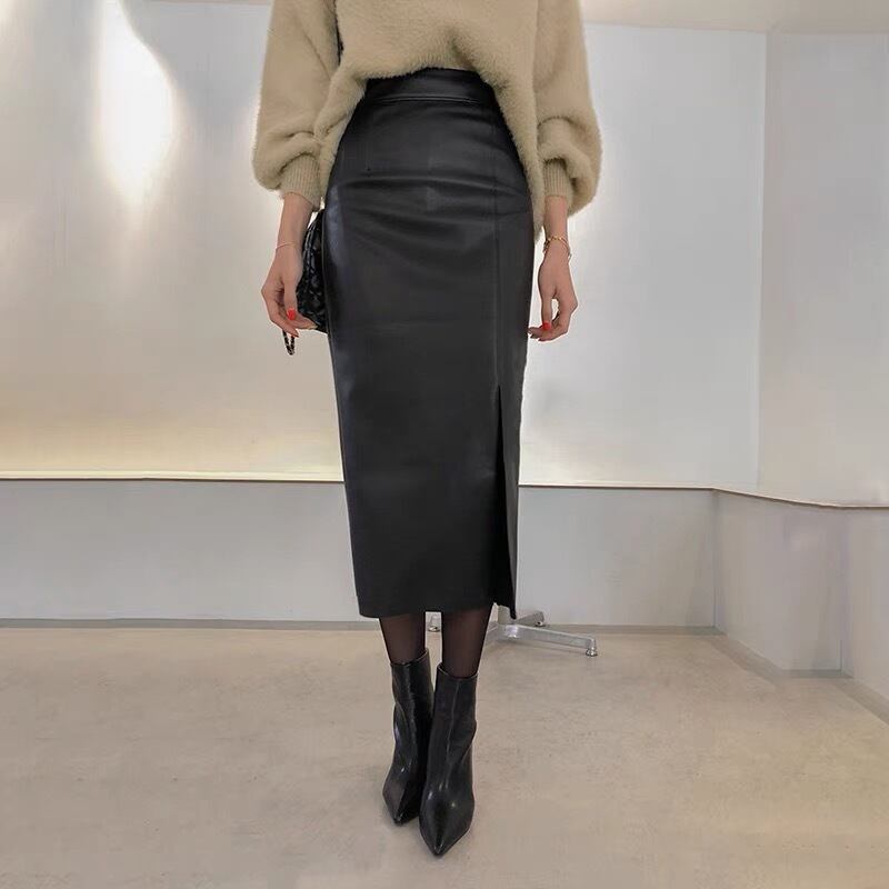 Pinkoz 女性エレガントな黒 PU レザーハイウエストミディスカートスリップペンシルオフィスレディファッションロングスカートシックな vestidos ヴィンテージ za ハイウェスト ピンク ブラック ビンテージ 会社 学校 通勤や通学にも