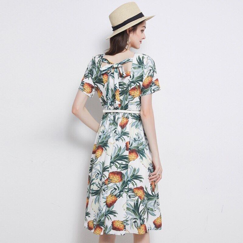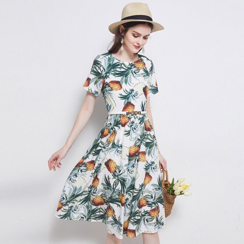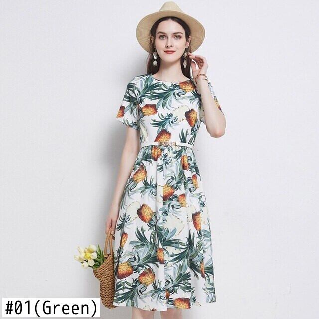 Pinkoz 夏 プリント パイナップル ミディドレス ベルト付き Oネック 半袖 ハイウエスト フローラル クライド カジュアル ローブ ベストドス デ フィエスタ ハイウェスト ショート ピンク ハーフスリーブ サマー 夏物 ハーネス 花柄