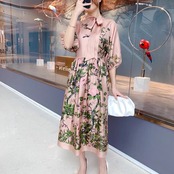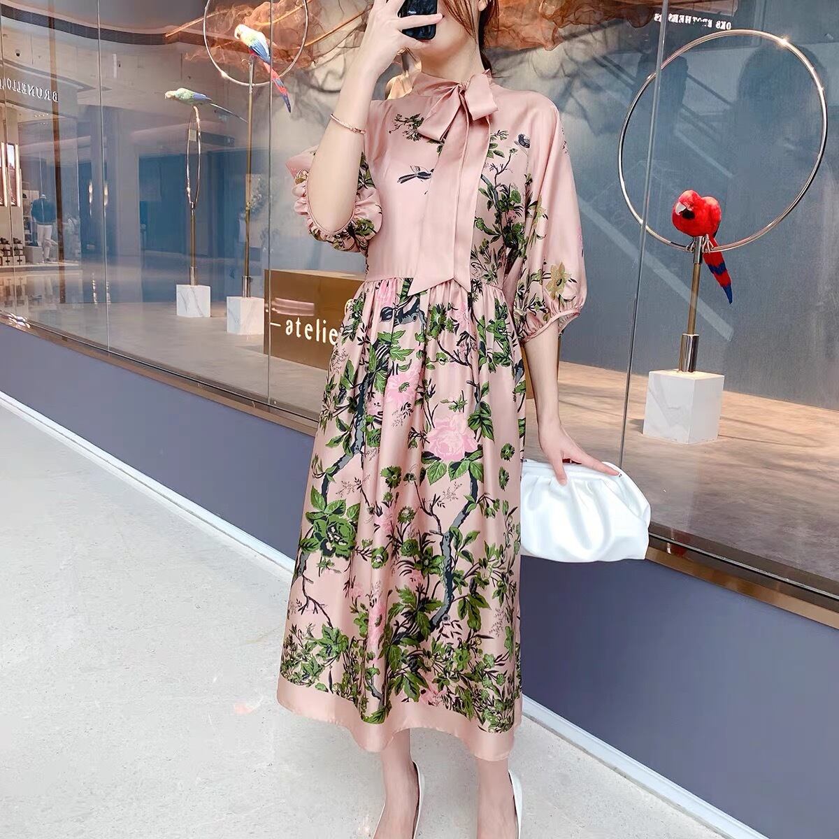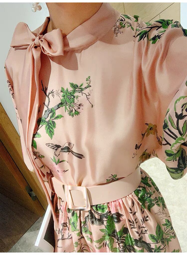 Pinkoz 女性エレガントなピンク花柄プリント弓襟ランタンスリーブ A ラインミディドレスファムホリデーカジュアルビッグサイズローブ mujer リボン Aライン フェミニン