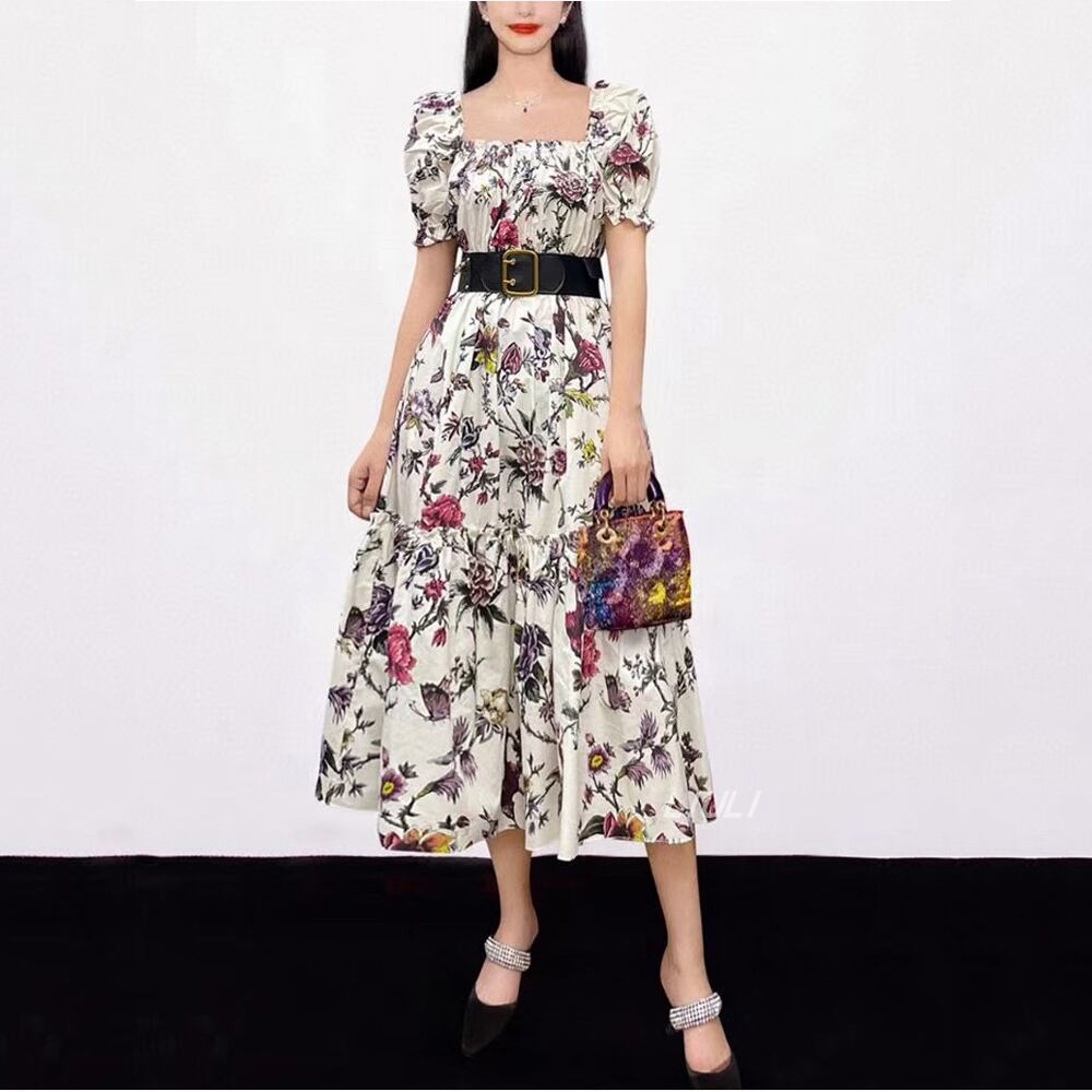 Pinkoz デザイナー スラッシュネック パフスリーブ サマー ホリデー ナイト 花柄 プリント ミディドレス ベルト付き 夜座 ピンク 夏物 ハーネス