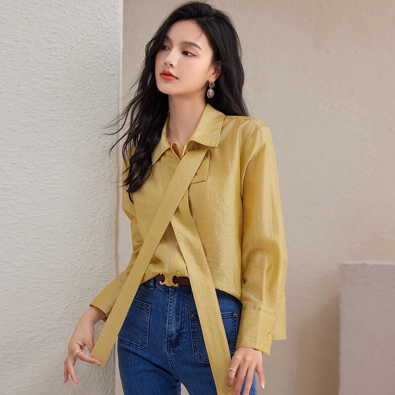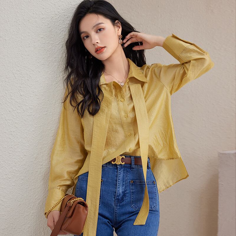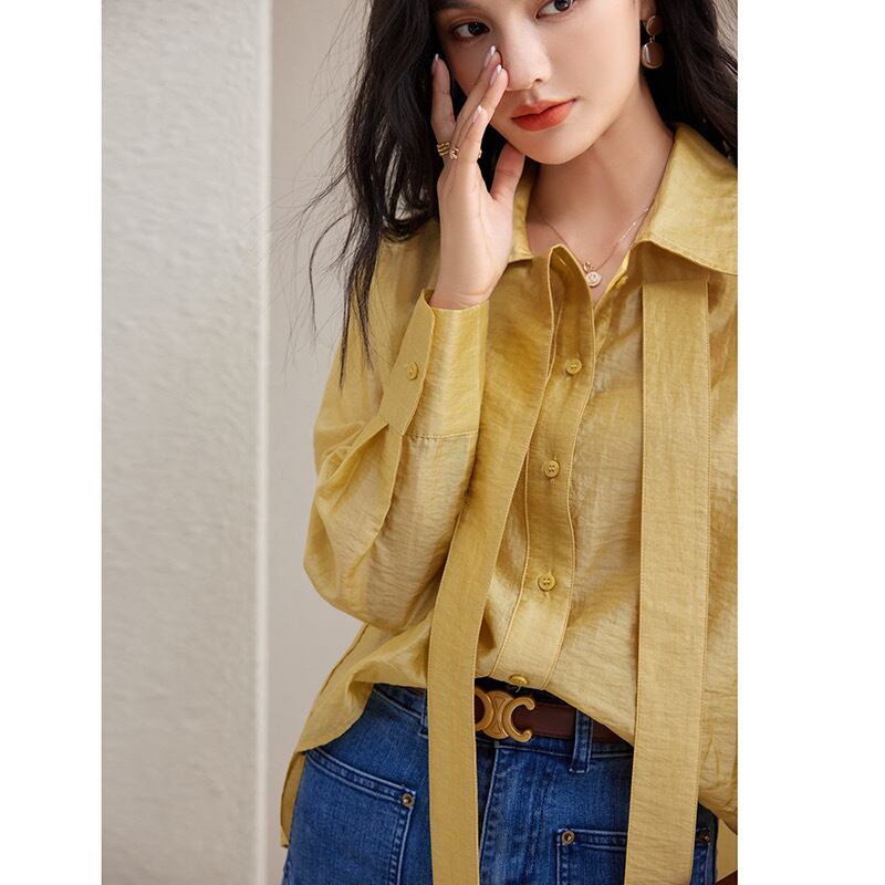 Pinkoz 秋春黄色フルスリーブ女性シャツターンダウン襟リボン弓レースアップフルスリーブ因果ヴィンテージエレガントなトップス ピンク スプリング 春物 オータム 秋物 ビンテージ