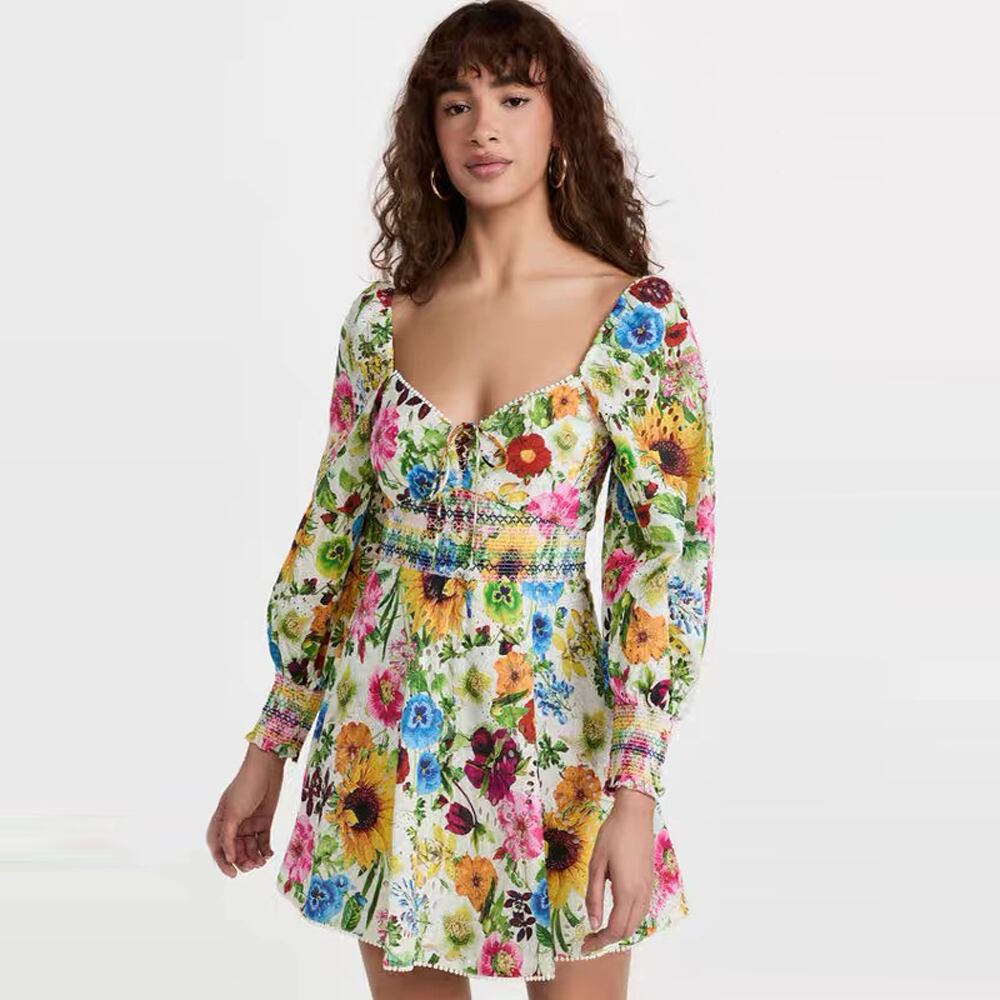 Pinkoz 女性花柄ミニドレス sqaure 襟背中の開いた自由奔放に生きるセクシーなハイウエストファッションファム服 vestidos ヴィンテージ traf ハイウェスト ピンク フェミニン ビンテージ