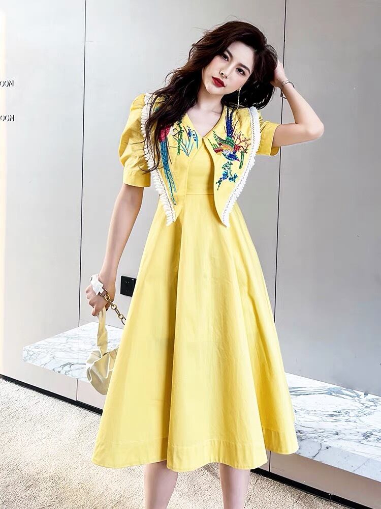 Pinkoz ヴィンテージ ピーターパン カラー スイート ミディ ドレス A ライン イエロー フラワー 刺繍 パッチワーク ファッション パーティー ローブ ピンク 大人ガーリー スウィート キュート カジュアル Aライン フラワーデザイン ビンテージ