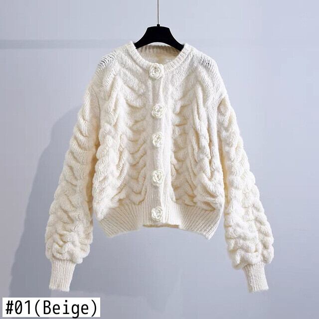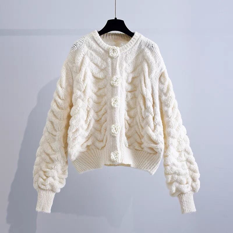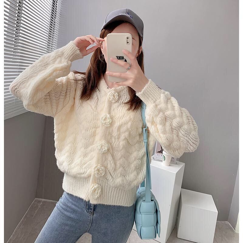 Pinkoz 女性ルーズショートライトブルー女性カーディガンシングルブレスト椿ボタンランタンスリーブ冬ニットティオプヴィンテージ ピンク ウィンター 冬物 ビンテージ