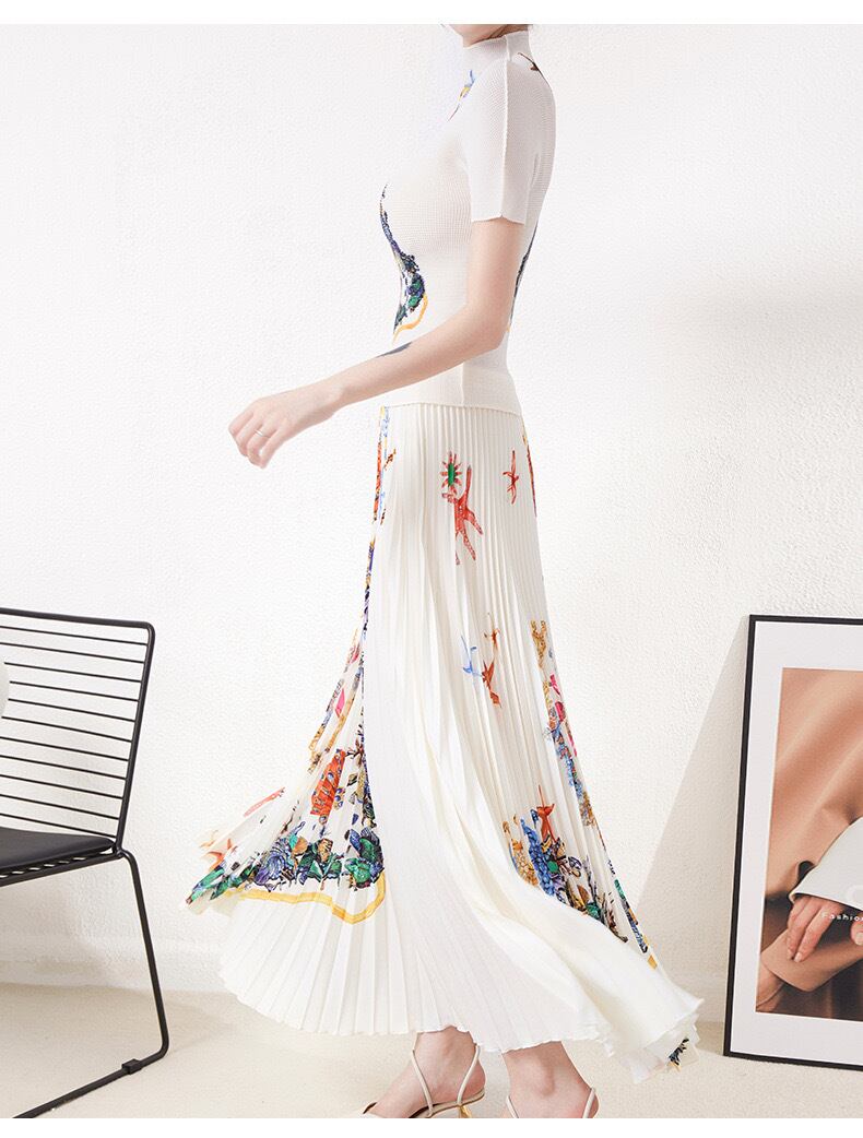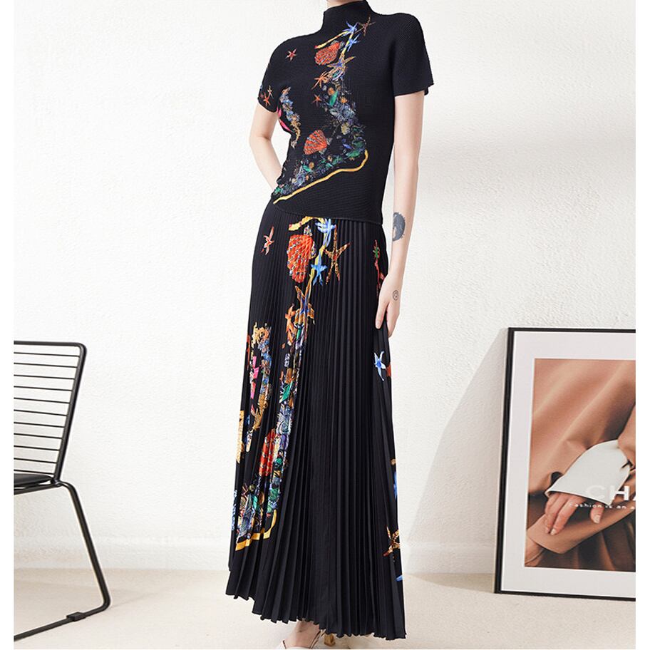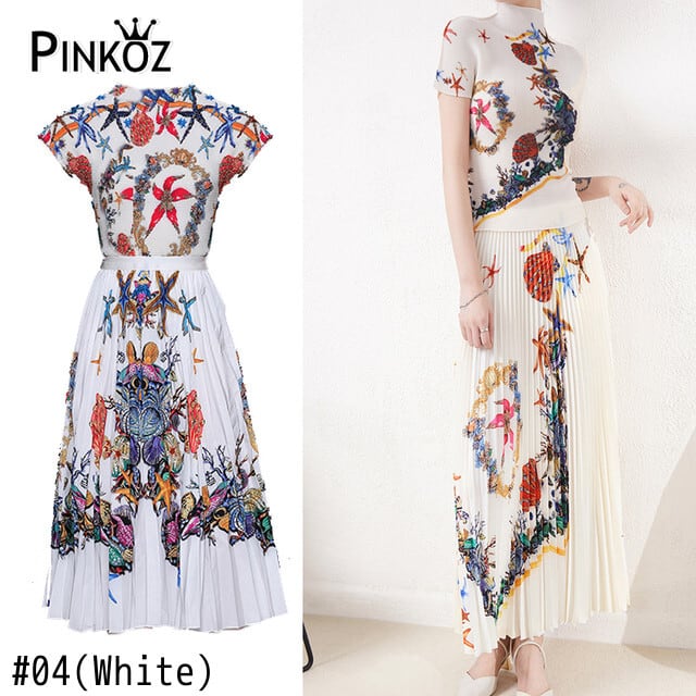Pinkoz 滑走路デザイナー スタイリッシュな 2 点セット ヒトデ パターン プリント プリーツ弾性トップス ロング スカート女性シックな服traf ピンク エラスティック 伸縮