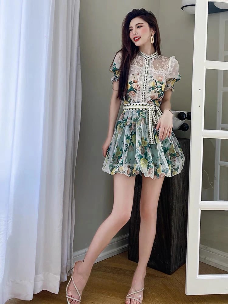 Pinkoz 2 ピース セット女性グリーン レース半袖夏ブラウス デザイナー シャツ + ミニ メッシュ スカート エレガントな甘い衣装ヴィンテージ ショート ピンク ハーフスリーブ 大人ガーリー スウィート キュート カジュアル サマー 夏物 ビンテージ