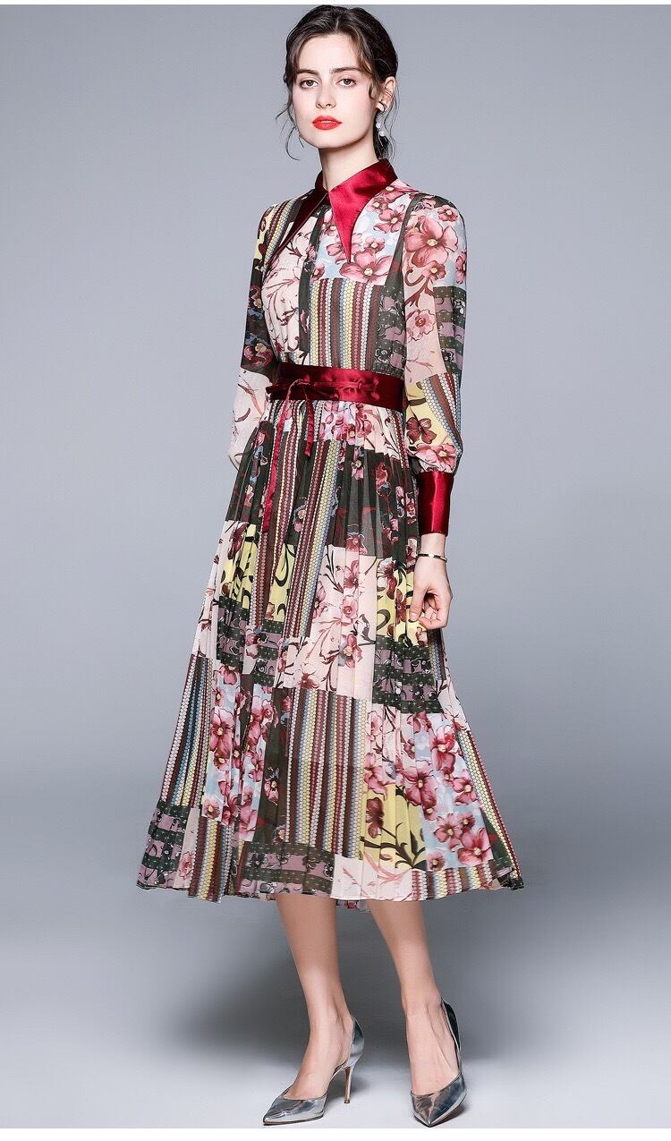 Pinkoz エレガントな女性ミディ ドレス ベルト ヴィンテージ プリント ターン ダウン襟長袖シフォン パッチワーク サテン パーティー カジュアル プラス サイズ ロング ピンク 大きめサイズ ハーネス ビンテージ