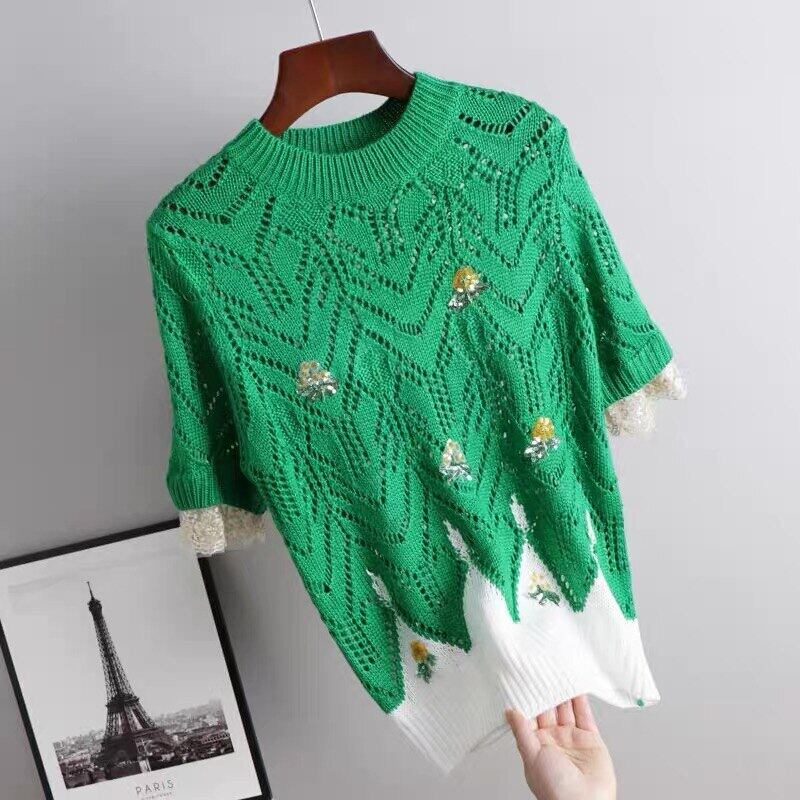 Pinkoz グリーン embroideried ニットトップス女性カジュアル夏ハイストリート半袖 o ネックファッションプルオーバーファム ショート ピンク ハーフスリーブ 刺繍 サマー 夏物 Oネック フェミニン