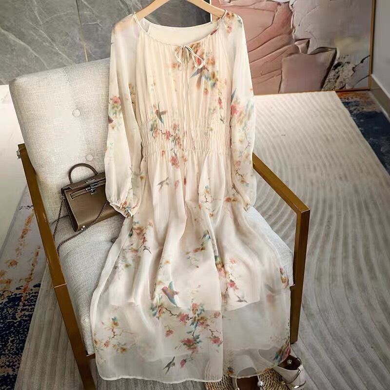 Pinkoz 女性ホリデーマキシドレスシフォン弾性待機レースアップ花柄プリント O ネックサマードレス女性カジュアルローブ ピンク エラスティック 伸縮 夏物 Oネック