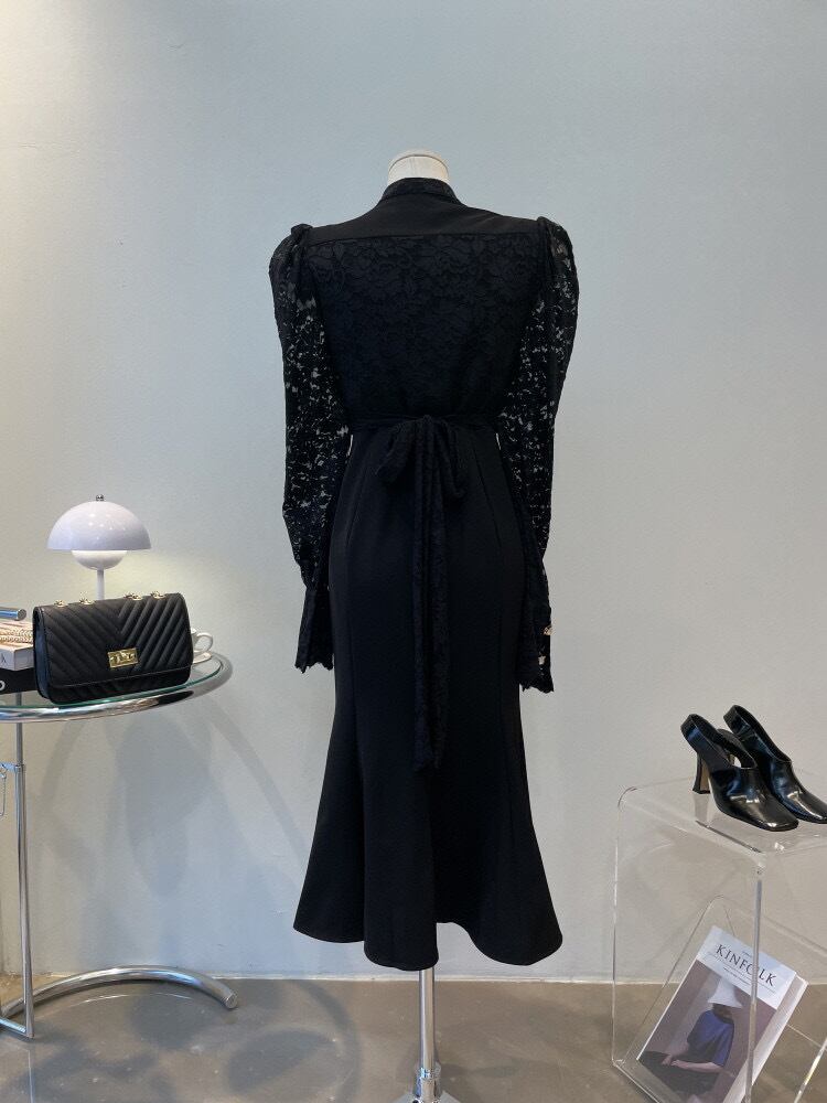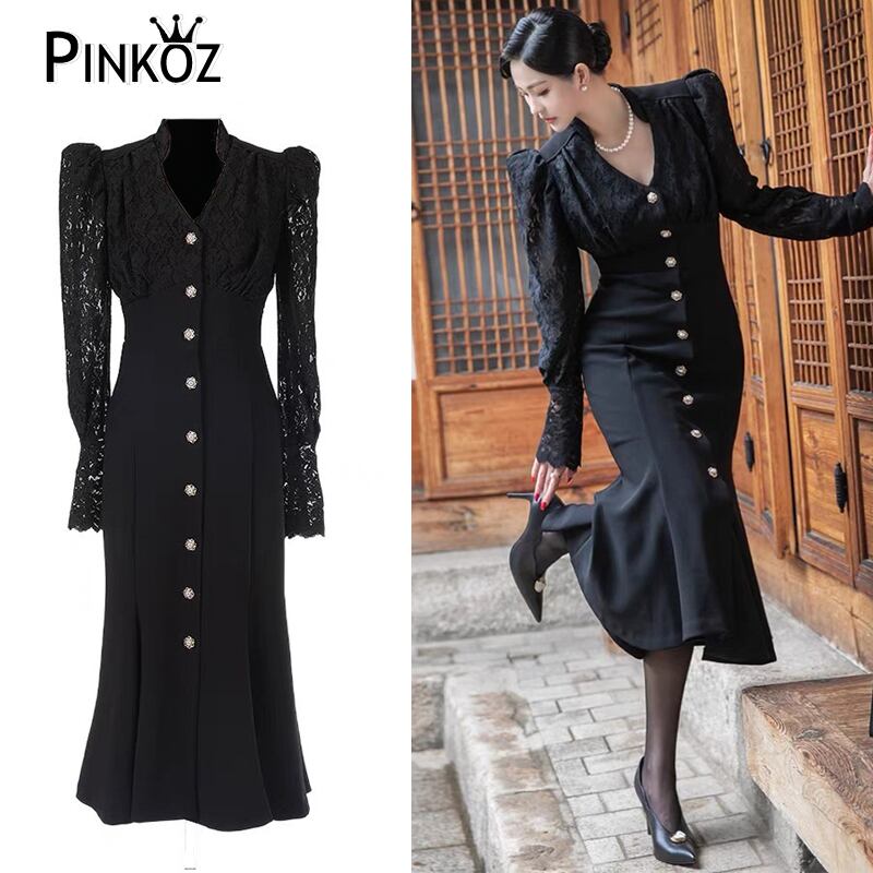 Pinkoz 女性韓国ファッション黒の冬のドレス v ネックパッチワークレーススリーブぬるぬるマーメイドシングルブレスト vestidos ピンク ブラック ウィンター 冬物 Vネック