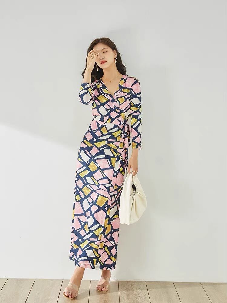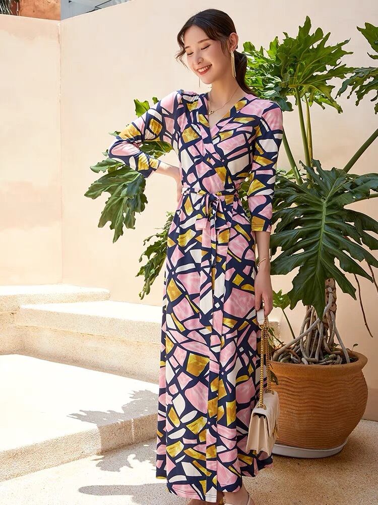 Pinkoz 女性韓国スタイルのファッションピンクの花プリント v ネック半袖セクシーなカジュアルマキシドレス毎日シックな自由奔放に生きるローブ vestidos ハーフスリーブ Vネック フラワーデザイン