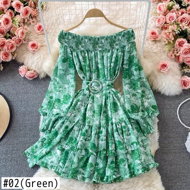 Pinkoz 夏スラッシュネックデザイナーフラワープリント女性ミニドレスフリルオフショルダー花柄自由奔放に生きるビーチドレス新 ピンク ラッフル サマー 夏物 フラワーデザイン