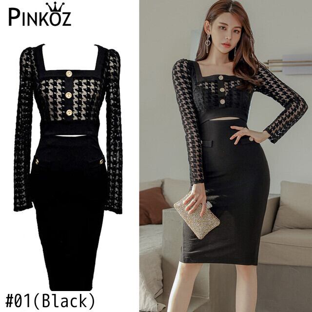Pinkoz 女性ドレス黒中空アウトスクエアカラーフルスリーブぬるぬるボディコンハイウエストボタン黒ドレスパーティーセクシーなローブ ハイウェスト ピンク ブラック スクウェア
