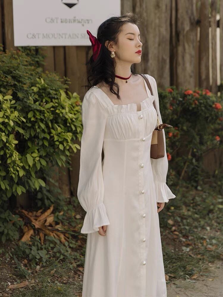 Pinkoz ヴィンテージ女性ドレス女性ハイウエストミディドレス白シングルブレストフレアスリーブパーティーかわいいローブ vestidos traf ハイウェスト ピンク ホワイト 大人ガーリー スウィート キュート カジュアル ビンテージ