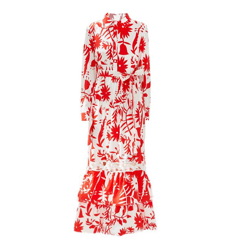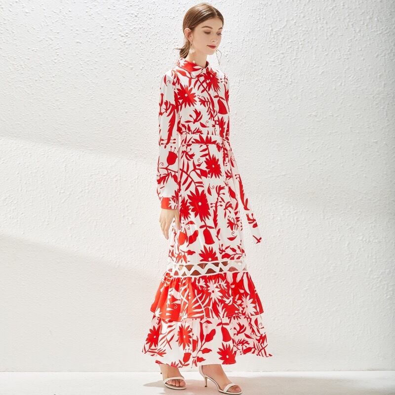 Pinkoz デザイナー レッド ロングスリーブ 秋の花 マキシドレス シングルブレスト パッチワーク 中空アウト ヒットカラー zevity ドレス フェスティバル ピンク 長袖 オータム 秋物 フラワーデザイン