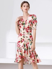 Pinkoz v ネックシャーリング フォールド ビーズ エレガントなマーメイド膝丈ドレス女性の夏の半袖フラワー プリント ドレス大 ショート ピンク ハーフスリーブ サマー 夏物 Vネック フラワーデザイン