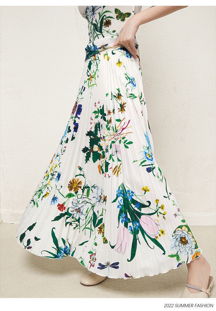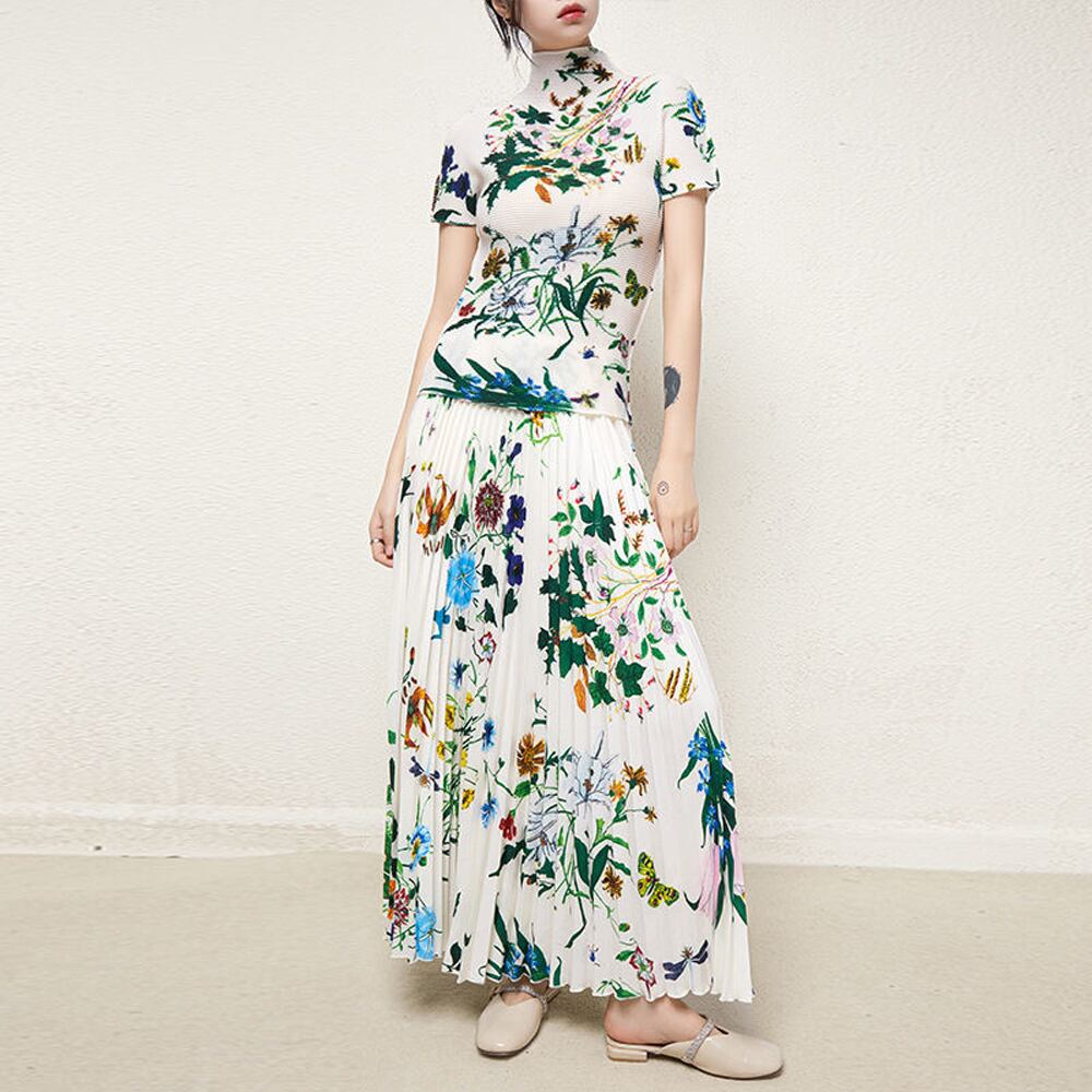 Pinkoz デザイナー花柄女性 2 点セット夏スタンド襟弾性トップスぬるぬる t プリーツ マキシ スカート衣装シックな座 ピンク エラスティック 伸縮 サマー 夏物 Tシャツ