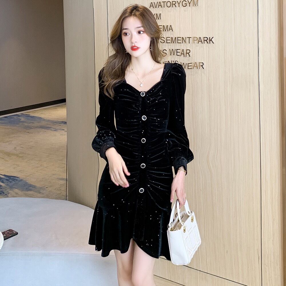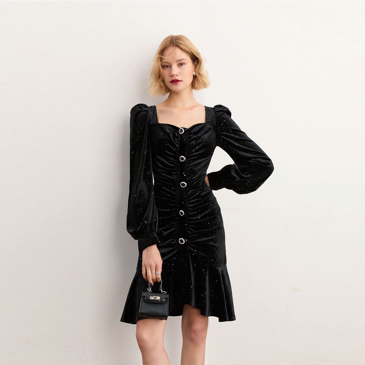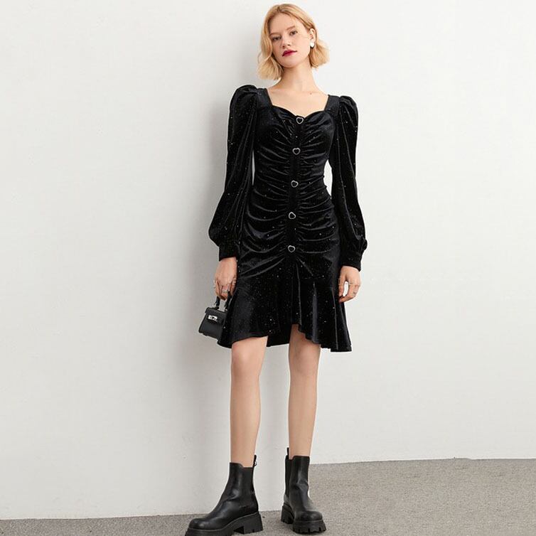 Pinkoz デザイナー スタイリッシュな女性黒膝丈ドレス シングル ブレスト ボタン ベルベット スクエア カラー ゴシック ドレス vestidos traf ピンク ブラック スクウェア