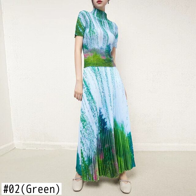 Pinkoz 2点セット 伸縮性 ファッション トップス 花柄 プリント スタンドカラー 半袖 トップス プリーツ ロング スカート セット 衣装 ヴィンテージ z ショート ピンク ハーフスリーブ エラスティック ビンテージ