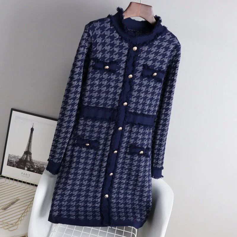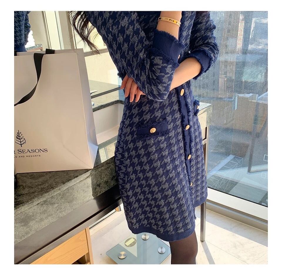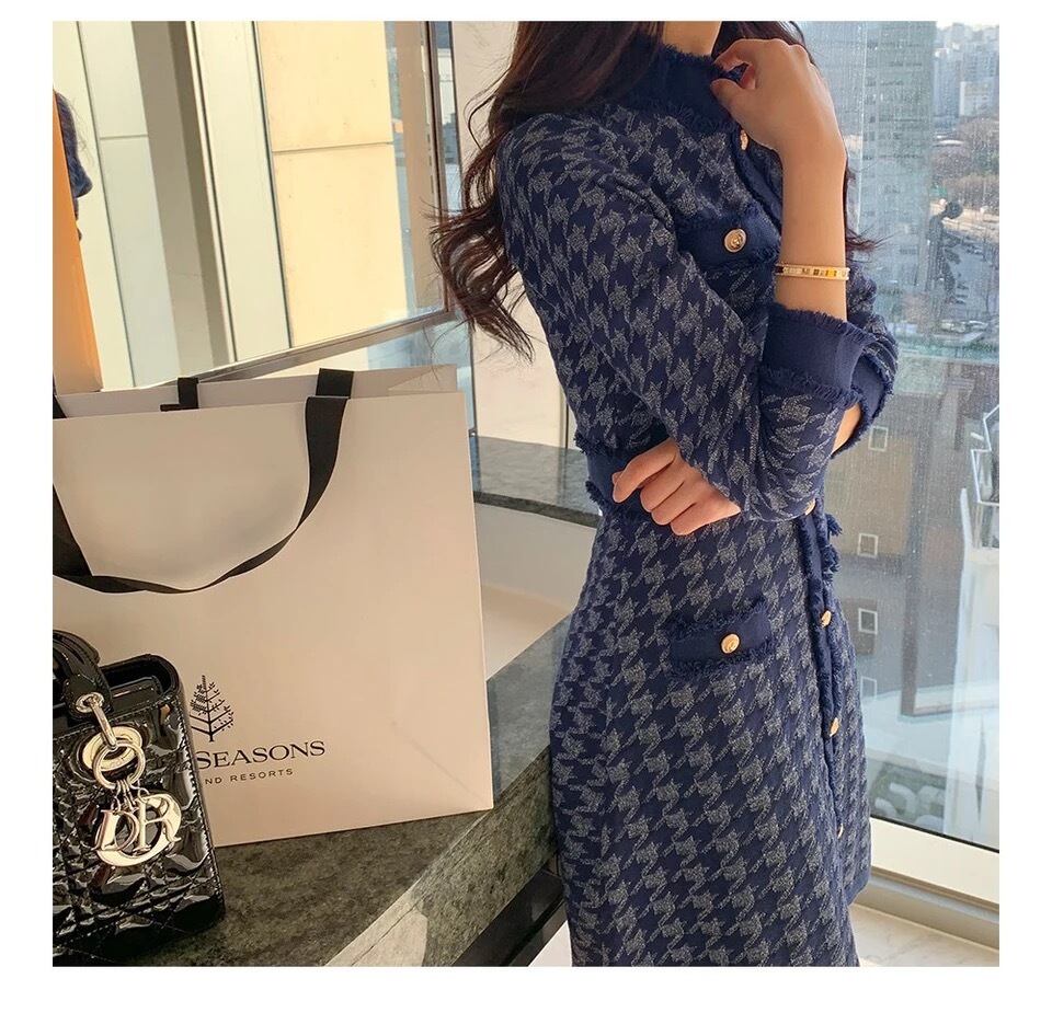 Pinkoz 女性の冬のニットミニドレス navyblue エレガントな千鳥格子ポケットセータードレスオフィスレディ tel robe de mujer za ピンク ブルー ウィンター 冬物 会社 学校 通勤や通学にも