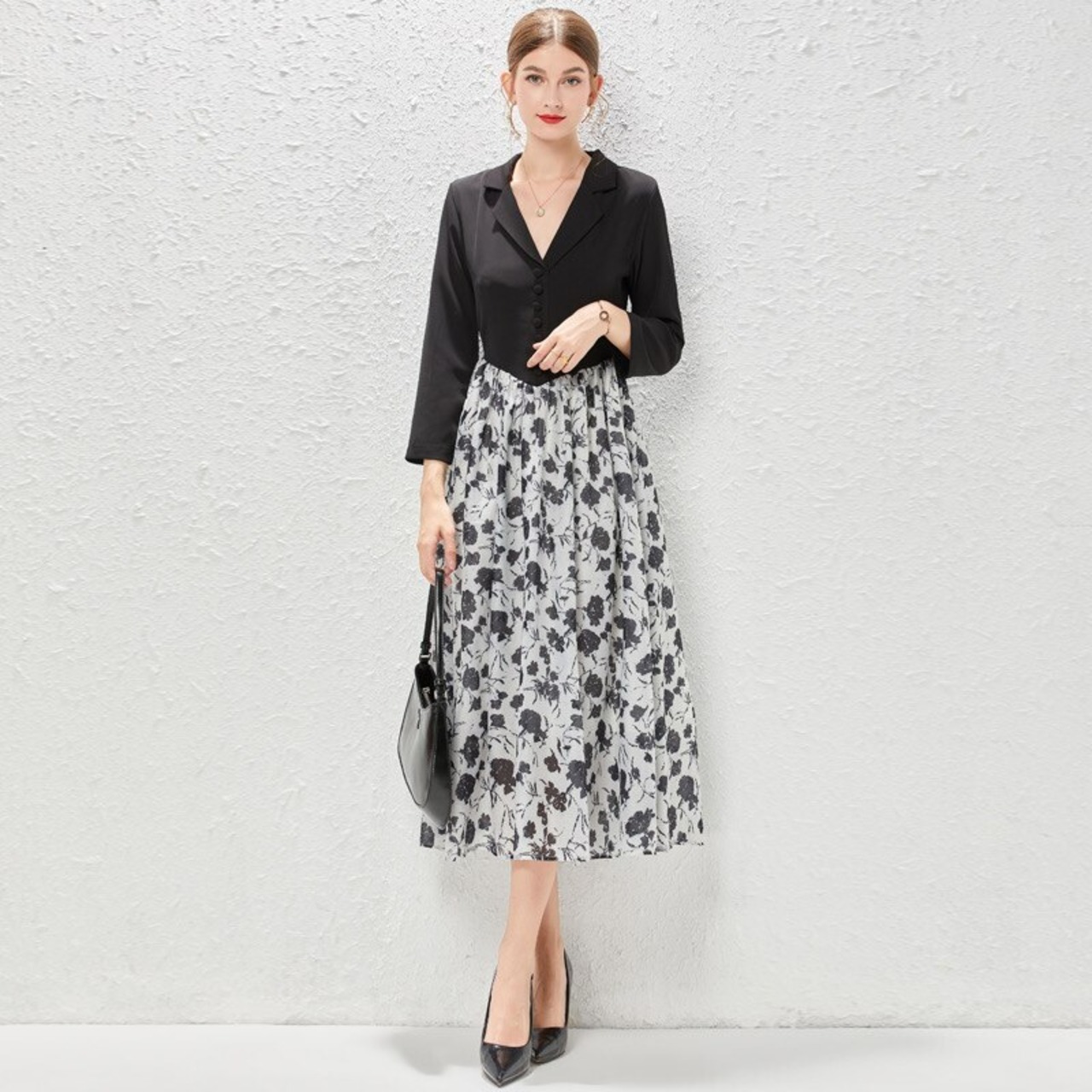 Pinkoz 女性エレガントなシングルブレスト v ネック半袖黒パッチワーク蝶柄プリントミディドレスファムワーク vestidos ピンク ブラック ハーフスリーブ Vネック フェミニン