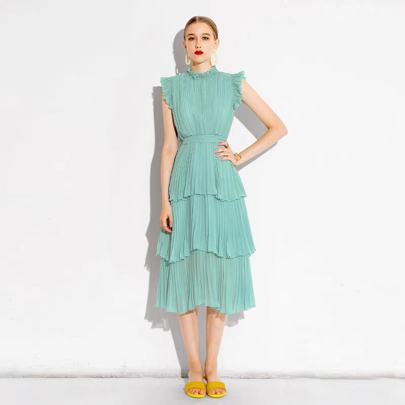 Pinkoz ファッション新緑プリーツミディドレス女性ノースリーブハイウエスト夏エレガントなオフィスレディドレスローブデ mujer y2k ハイウェスト ピンク サマー 夏物 グリーン 会社 学校 通勤や通学にも