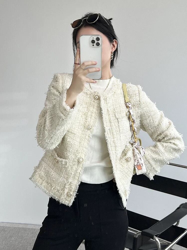 Pinkoz 滑走路デザイナー エレガント ホワイト ツイード tel ボタン作業服ファム コート ファッション トップス ジャケット女性冬秋 ピンク オータム 秋物 ウィンター 冬物 フェミニン