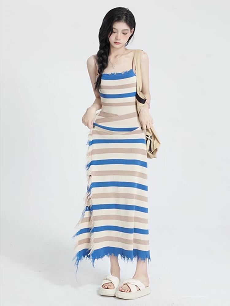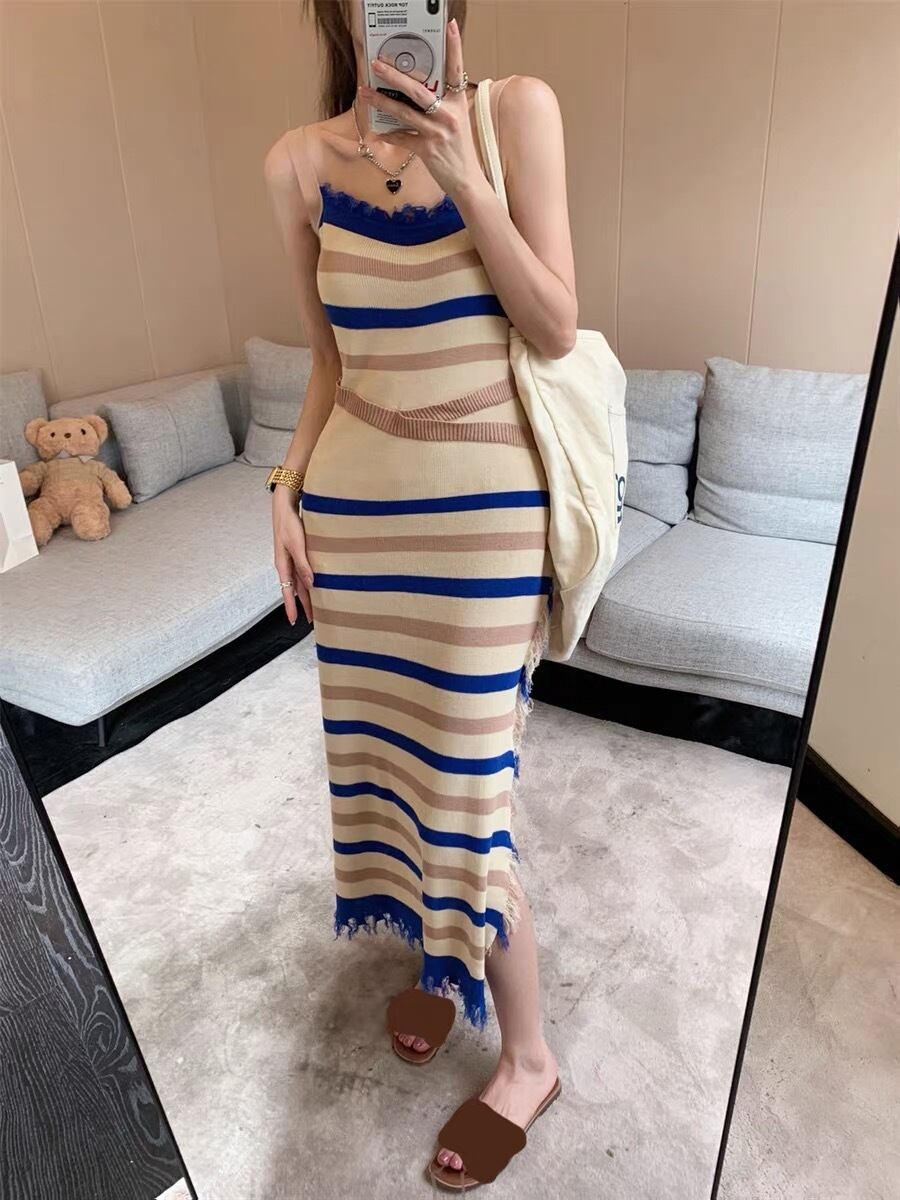 Pinkoz デザイナー スタイリッシュなストライプ tel スパゲッティ ストラップ セクシーな女性ミディ ドレス ニット キャミソール セーター ドレス ヴィンテージ vestidos ピンク ビンテージ