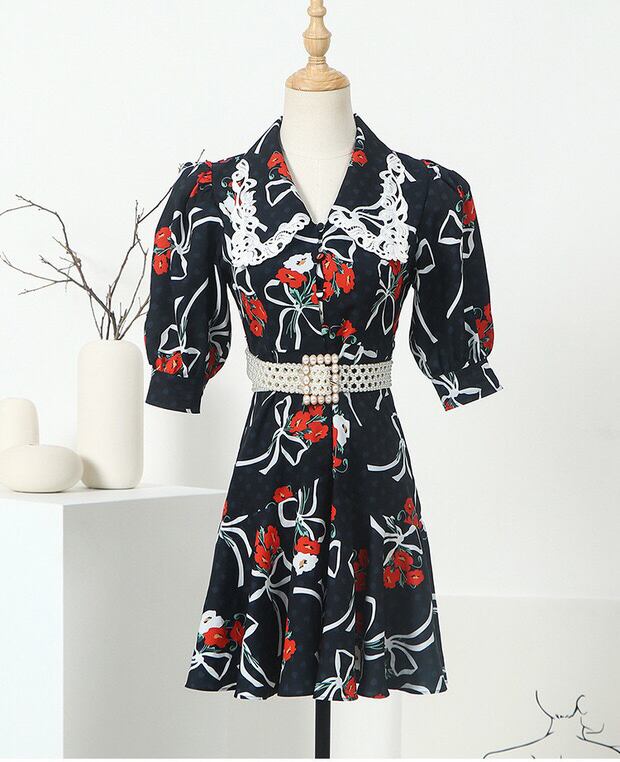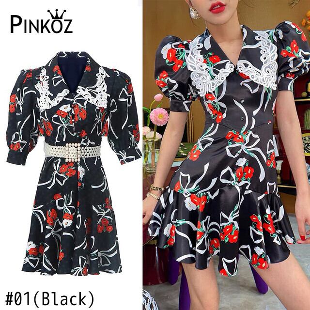 Pinkoz セレブ デザイナー ヴィンテージ フラワー プリント パッチワーク パーター パン カラー サマー ミニ ドレス ベルト付き ビーズ ラグジュアリー パーティー 座 ピンク 夏物 ハーネス フラワーデザイン ビンテージ