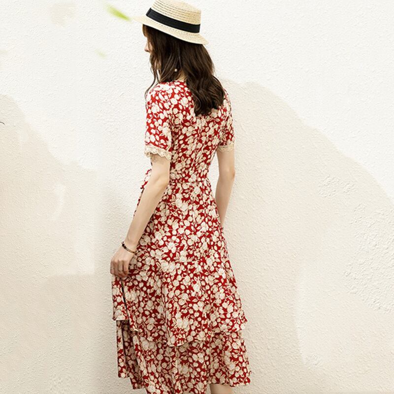 Pinkoz 夏ミディドレスセクシーなビーチ V ネックレースアップフローラルプリントカジュアル女性ドレスパッチワークレース vestido デ mujer ヴィンテージ ピンク サマー 夏物 花柄 Vネック ビンテージ